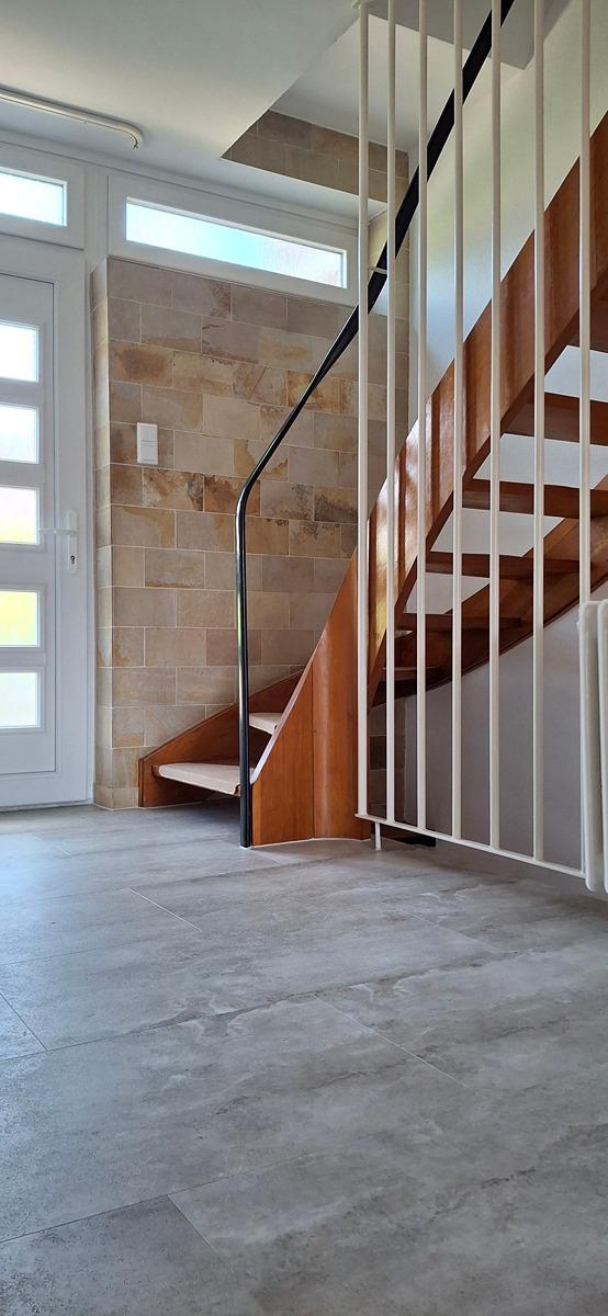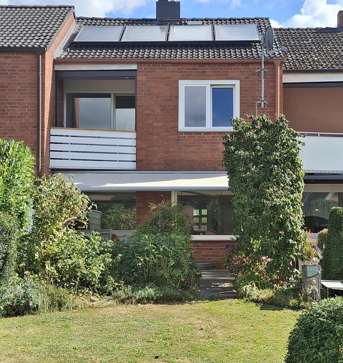 Das Reihenmittelaus wurde 2025 renoviert. Es liegt in ruhiger Nachbarschaft und hat eine Garage. Es ist 2018 mit neuen Fenstern ausgestattet worden. Eine Solarthermieanlage unterstützt kostenfrei die Warmwasserbereitung. Die Küche im Landhausstil (weiß) ist nach Osten ausgerichtet und hat Morgensonne. Das Wohn- und Esszimmer liegt nach Westen und gibt einen schönen Blick über die Terrasse in den Garten frei. Mit einer Markise über die ganze Breite der Terrasse kann man hier schöne Sommer genießen. Es gibt einen Außenwasserhahn um den Garten bequem zu gießen. Vom Schlafzimmer aus kommt man auf einen Balkon. Der Keller hat einen ausgebauten Raum und einen Vorratskeller. Der Heizungskeller bietet Platz für Werkzeug/Geräte und hier steht die Waschmaschine auf einem erhöhten Sockel.