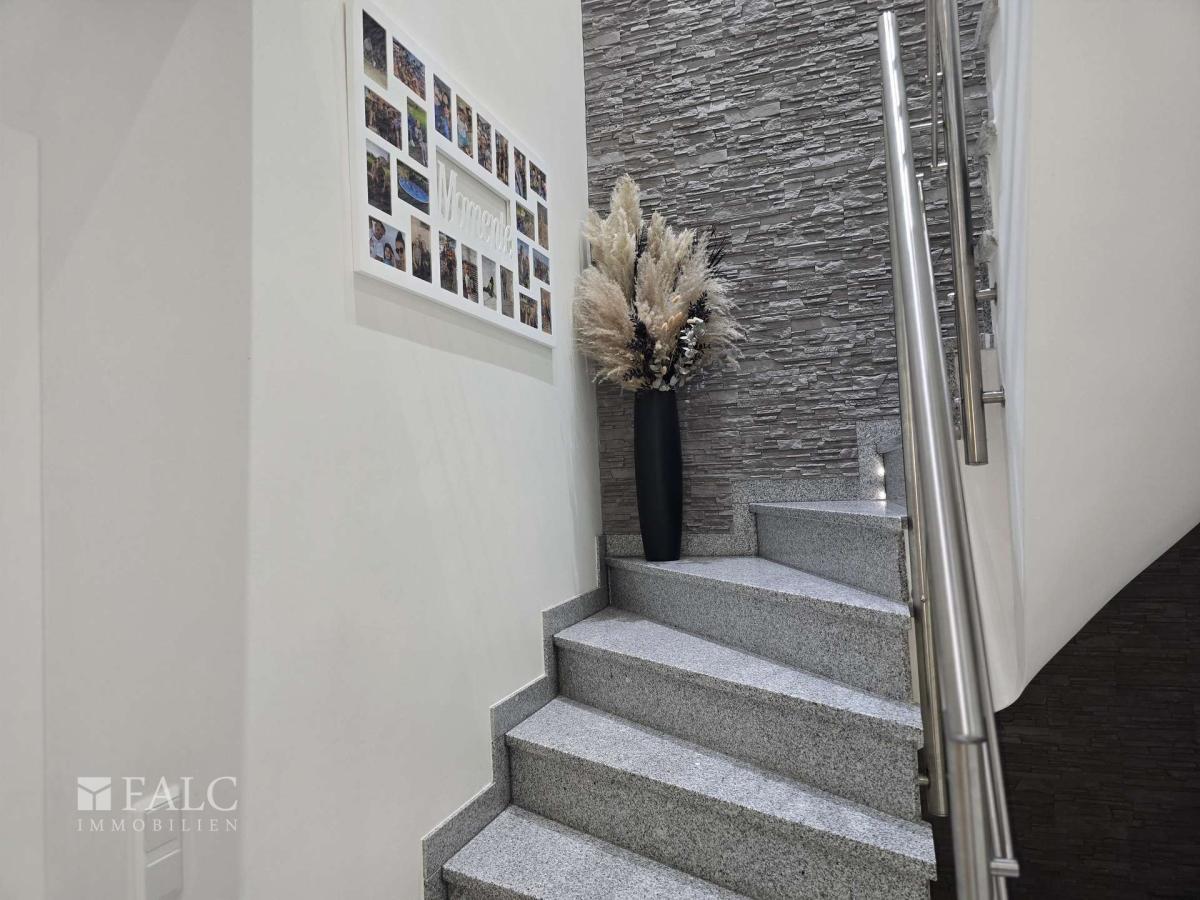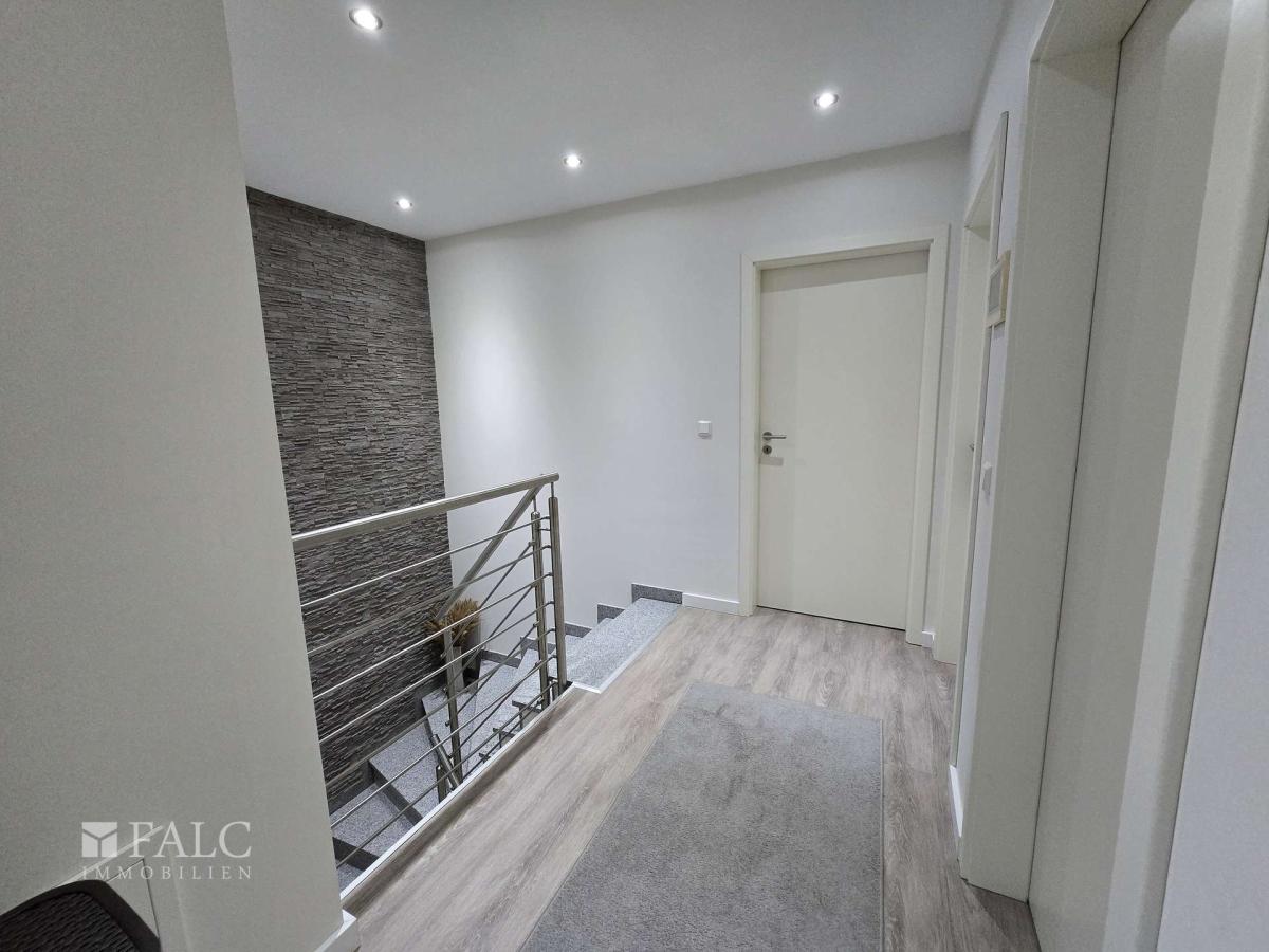 Über eine stilvolle Treppe gelangen Sie in das Obergeschoss, wo sich das Hauptschlafzimmer mit einem geräumigen Kleiderschrank befindet. Zwei weitere Zimmer bieten flexible Nutzungsmöglichkeiten, sei es als Kinderzimmer, Büro oder Gästezimmer. Das große Badezimmer auf dieser Etage ist mit modernen Armaturen und einer komfortablen Dusche und Badewanne ausgestattet. Zudem stehen Ihnen zwei separate Waschtische zur Verfügung.