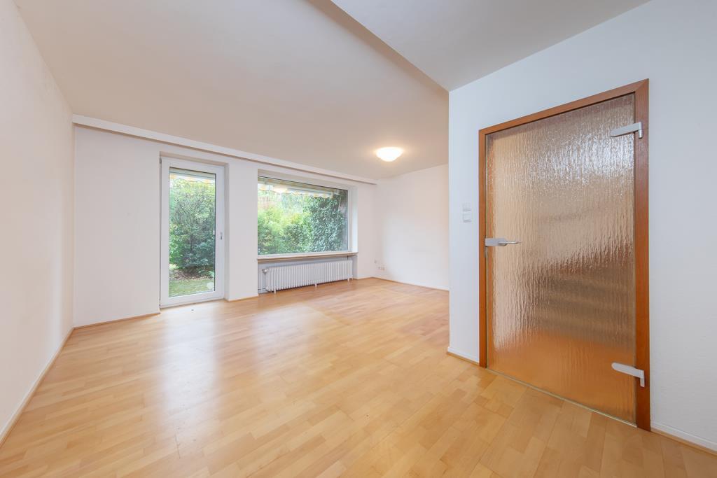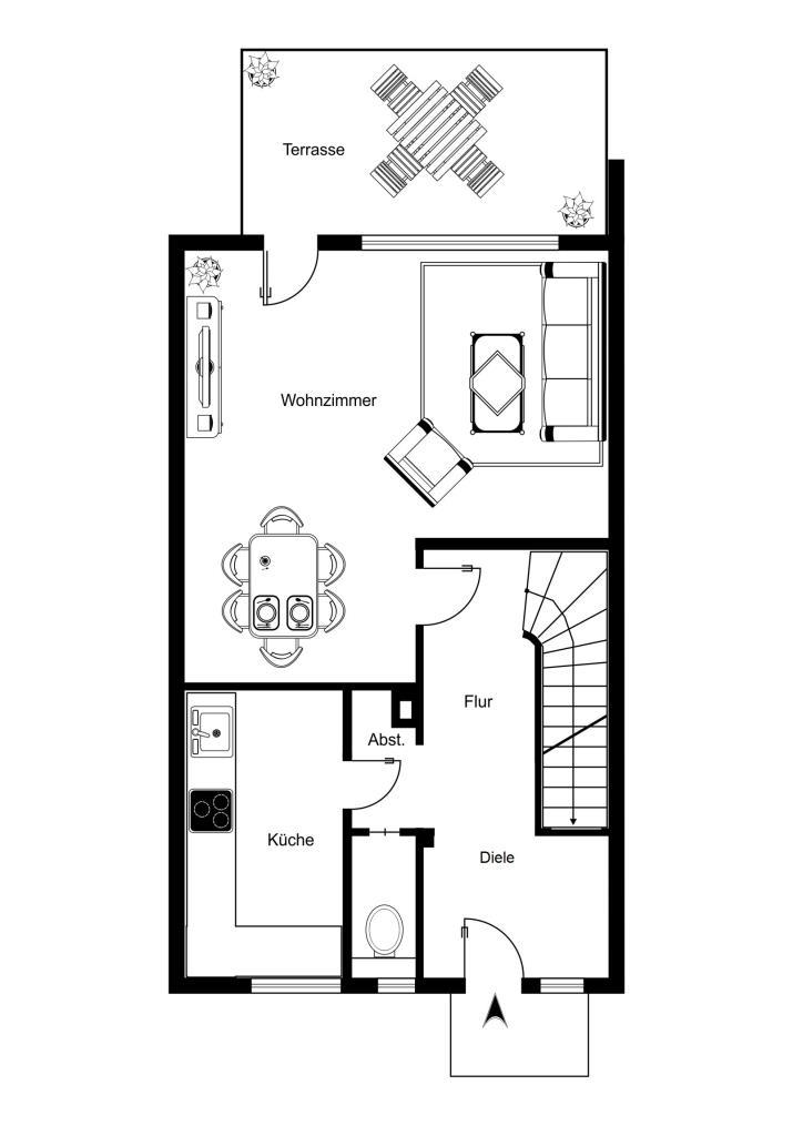 Der Diele folgend befindet sich das Herzstück des Hauses – der lichtdurchflutete Wohn- und Essbereich. Durch den pfiffigen Schnitt lässt sich hier eine individuelle Raumaufteilung herstellen. Platz für eine gemütliche Sofalandschaft sowie einen Esstisch finden Sie allemal. Besonders bestechen kann der Raum mit seiner großen Fensterfront. Von hier gelangen Sie auf die sonnige Terrasse in Südwest-Ausrichtung sowie den ruhigen Gartenbereich.