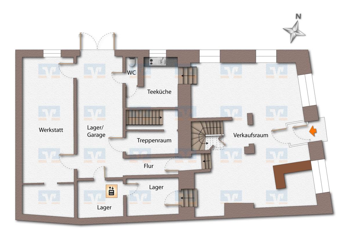 Erdgeschoss: Erster Gebäudeabschnitt (Vorderhaus): Ladeneinheit mit ca. 70 m² Verkaufsraum plus Teeküche und WC. Werkstatt und Lagerflächen (ehem. Garage) im zweiten Gebäudeabschnitt (Nebenhaus), separater Zugang.