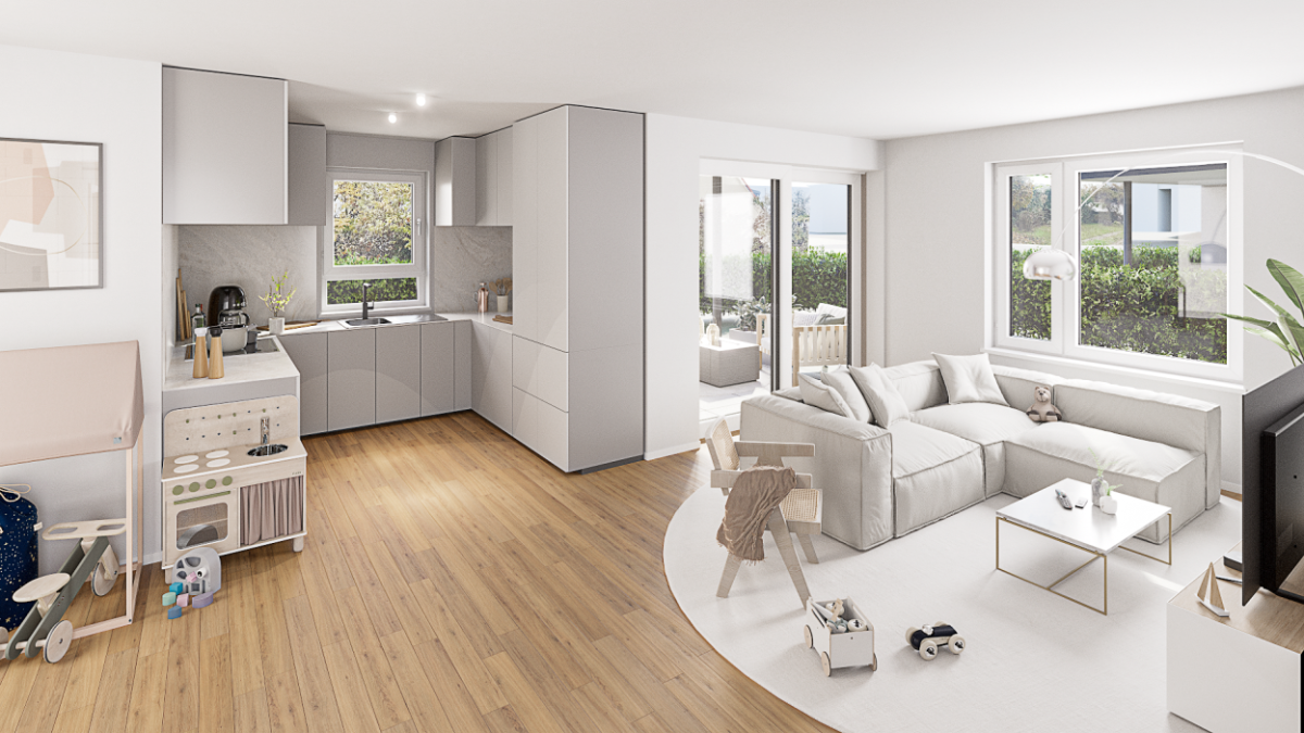 - Großzügiger Wohn- und Essbereich mit offener Küche und direktem Zugang zur Terrasse mit eigenem Gartenanteil.