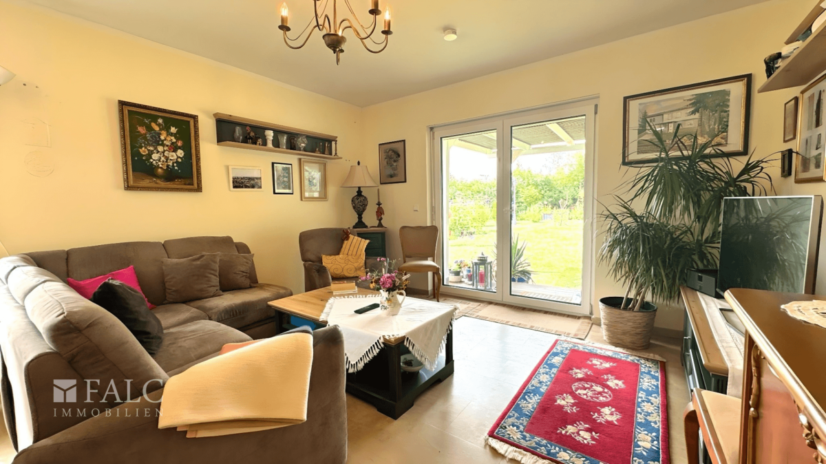 - Wohnzimmer mit groĂźen, bodentiefen Fenstern