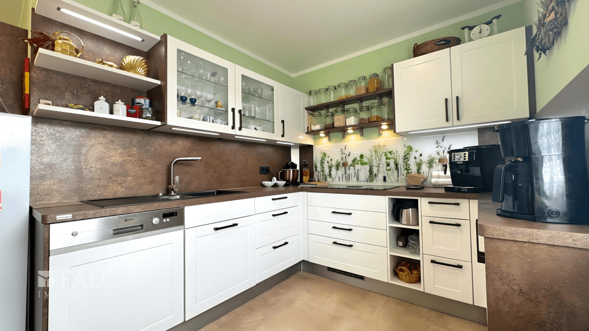 Die offene, moderne Einbauküche fügt sich nahtlos in den Wohnbereich ein und lässt dank hochwertiger Ausstattung keine Wünsche offen. Teilweise bestehen auf den verbauten Geräten sowie auf dem Haus selbst noch gültige Gewährleistungen, was zusätzliche Sicherheit bietet. Im gesamten Gebäude wurde auf hochwertigen Bodenbelag gesetzt – eine Kombination aus Fliesen und pflegeleichtem Vinyl. Eine durchgängige Fußbodenheizung sorgt für behagliche Wärme in allen Räumen.