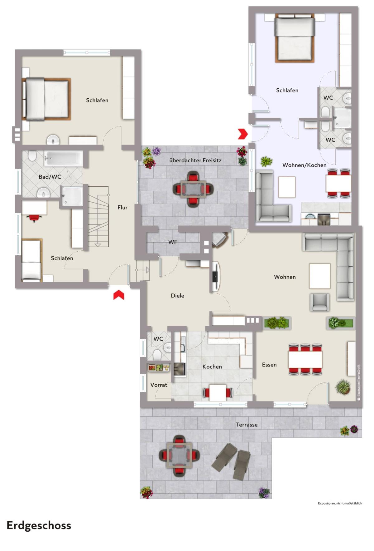 Wohnung 2: lichtdurchfluteter Wohn- /Essbereich mit Zugang zur Terrasse, Küche, Schlafzimmer, Duschbad, Gäste-WC, Flur, Hauswirtschaftsraum