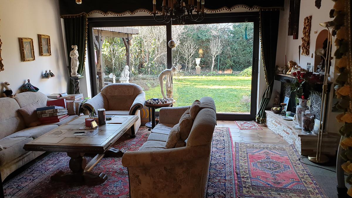 Im Erdgeschoss befindet sich ein geräumiges Wohnzimmer mit Zugang zur Südterrasse und ein großer Durchgang zum Kaminzimmer mit Zugang zum Garten. Die Eingangstüre ist durch einen Glaswindfang geschützt.