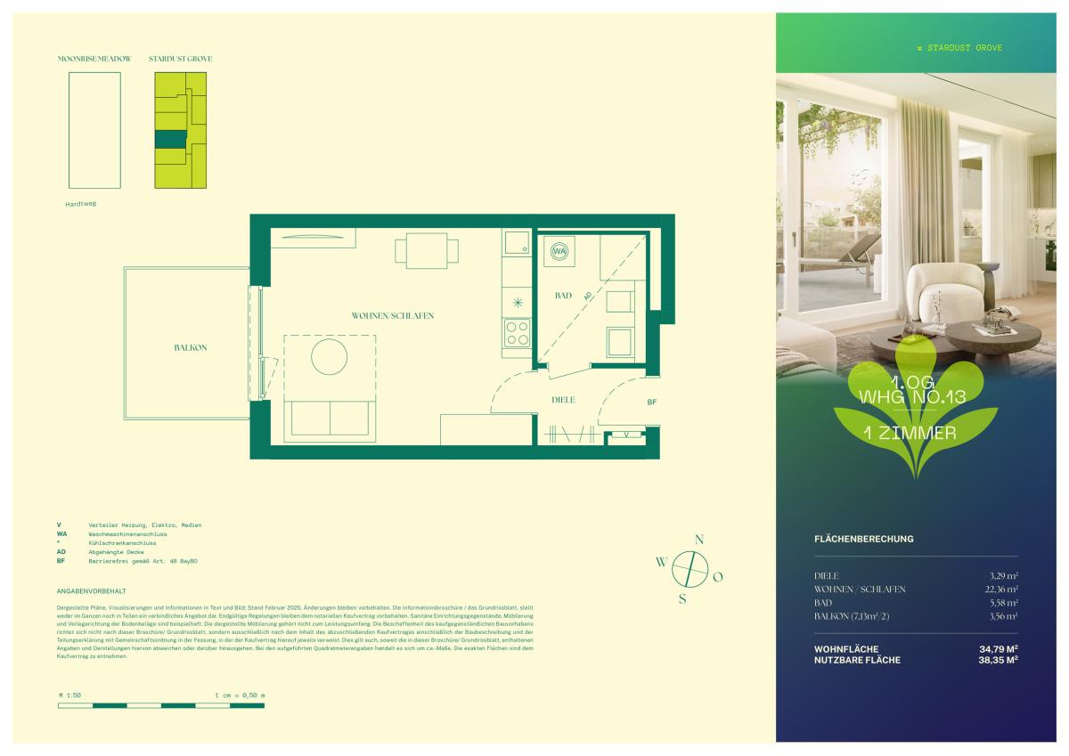 Diese Wohnung ist wie ein aufgeräumtes Notizbuch – jedes Detail hat seinen Platz und schafft Übersicht. Auf 34,5 m² wird Wohnen, Schlafen und Arbeiten in einem offenen Raum vereint, der durch bodentiefe Fenster hell erstrahlt. Der Balkon erweitert diesen Bereich wie eine kleine Bühne ins Freie – ein Ort, an dem der Alltag kurz Pause macht.