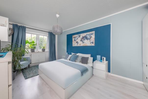 Das gut geschnittene Schlafzimmer präsentiert sich ruhig gelegen und bietet genügend Raum für ein großes Bett sowie weitere Möbel – die ideale Umgebung für erholsame Nächte.