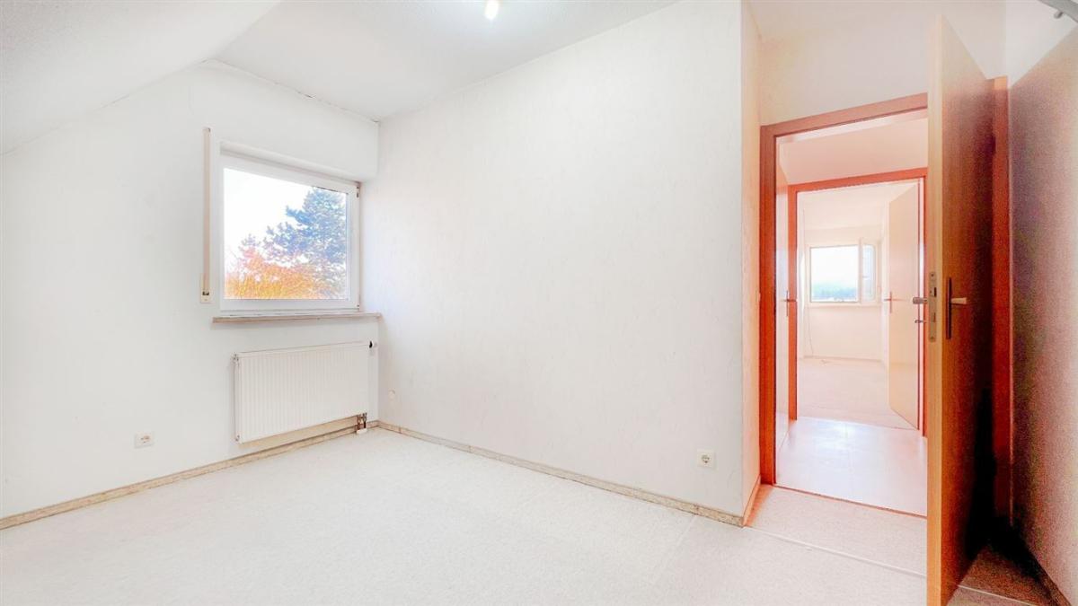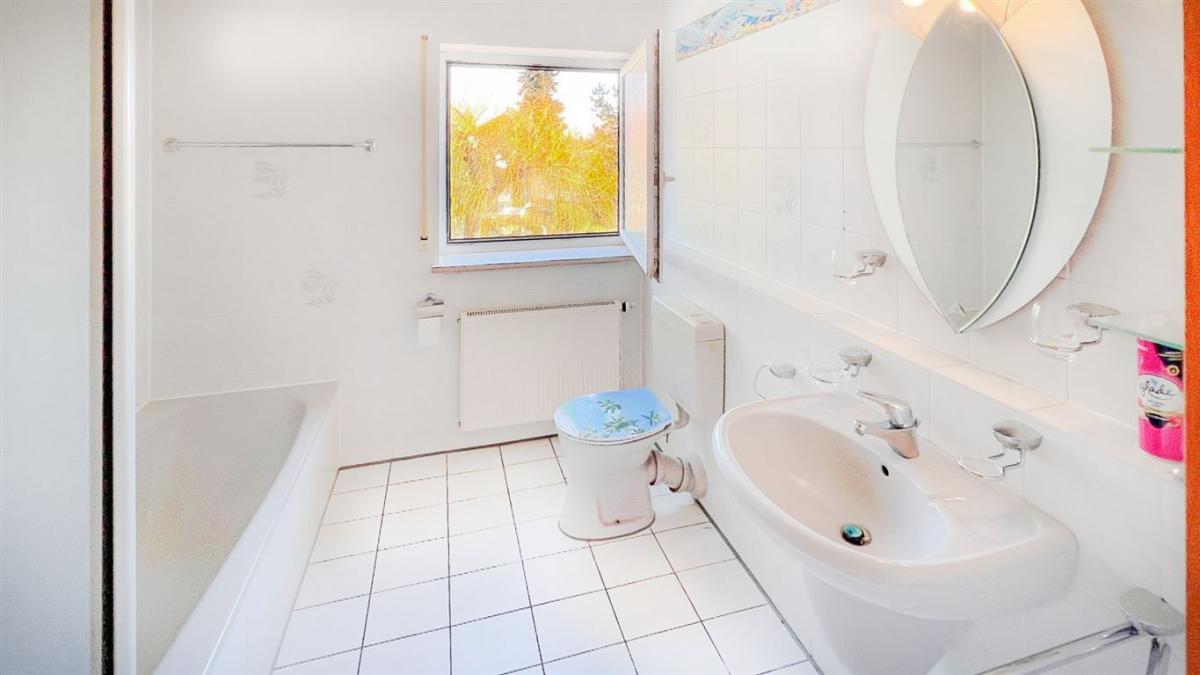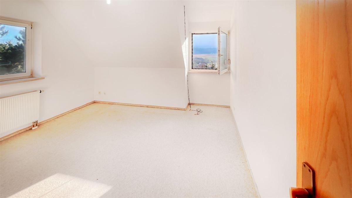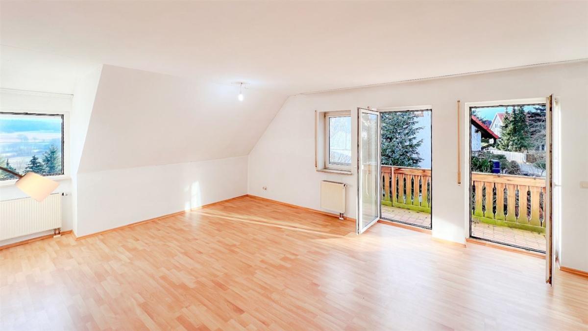 Auch die Dachgeschosswohnung besticht mit ihren ca. 105 m² durch ein großzügiges Raumgefühl und ihre freundliche Gestaltung. Sie verfügt über einen beeindruckenden, westlich ausgerichteten Balkon, der zum Verweilen einlädt. Beide Wohneinheiten bieten einen unvergleichlichen Panoramablick über die malerische Landschaft und den gepflegten Garten.