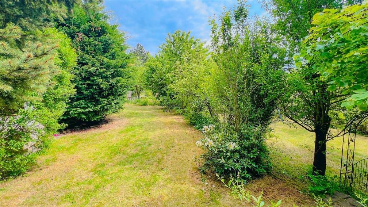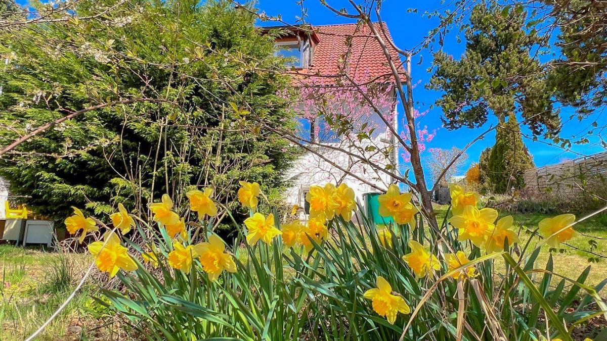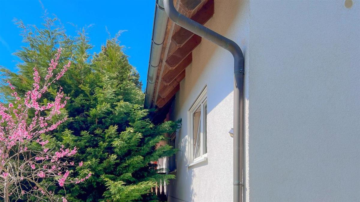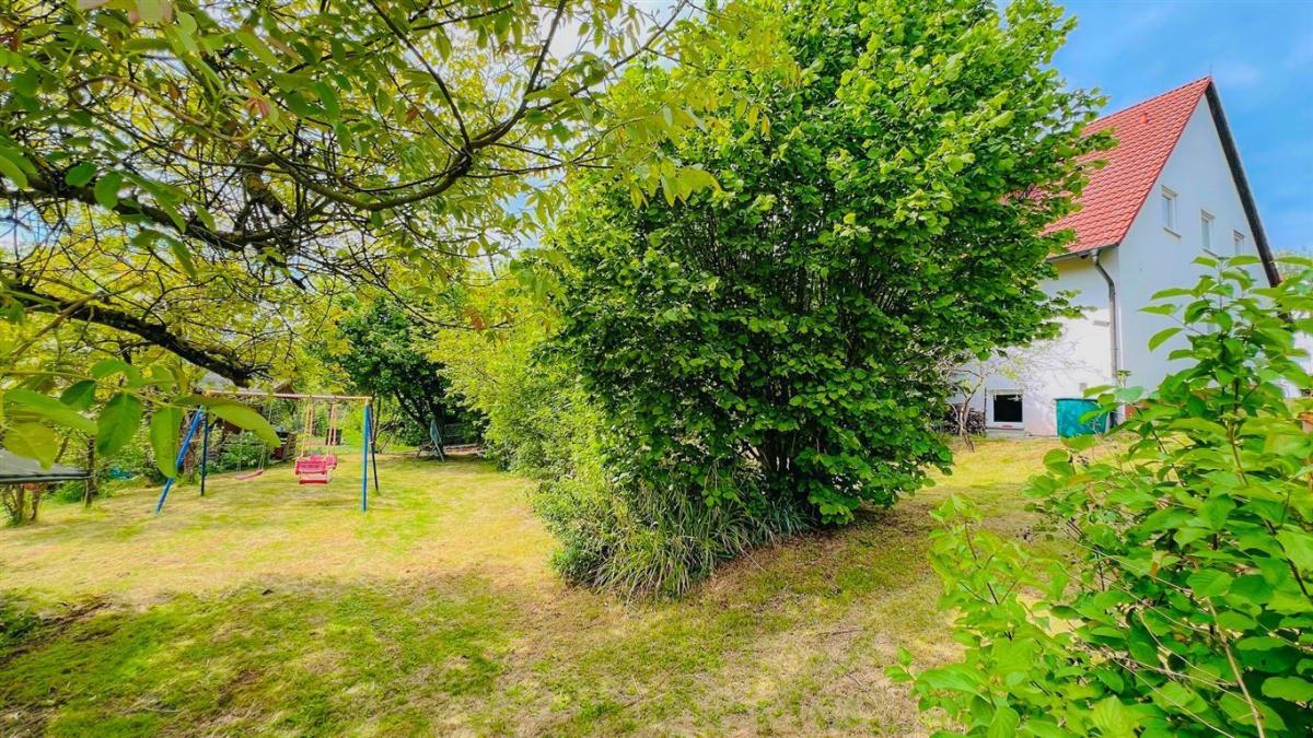 Von der unteren Hangseite aus präsentiert sich das Anwesen erhaben, eingebettet in einen großzügigen, liebevoll gestalteten Garten. Die terrassenförmige Anlage schafft zwei harmonische Rasenflächen und unterstreicht die idyllische Atmosphäre.