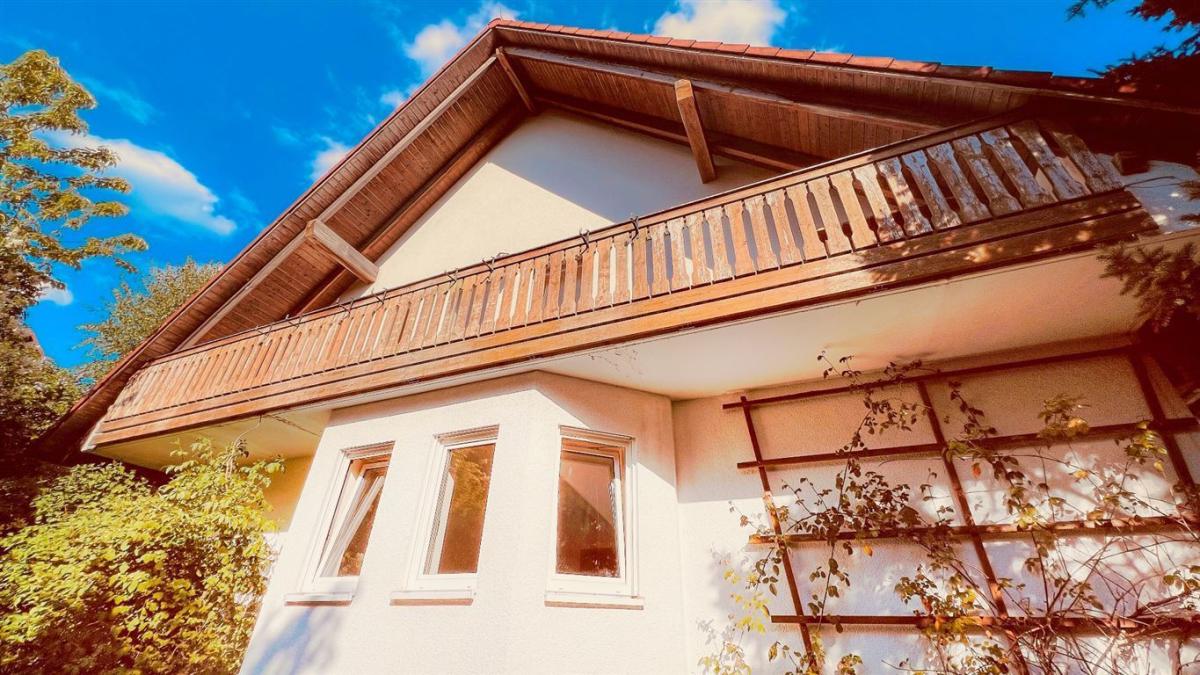 Zum Verkauf steht ein stilvolles Zweifamilienhaus, dessen Hanglage ihm die Anmutung eines großzügigen Einfamilienhauses verleiht. Von der Straßenseite aus eröffnet sich der Blick leicht abwärts auf das elegante Satteldach mit seinen charmanten Dachgauben und dem weitläufigen Westbalkon – ein architektonisches Highlight, das an die traditionelle Bauweise des Voralpenlands erinnert.
