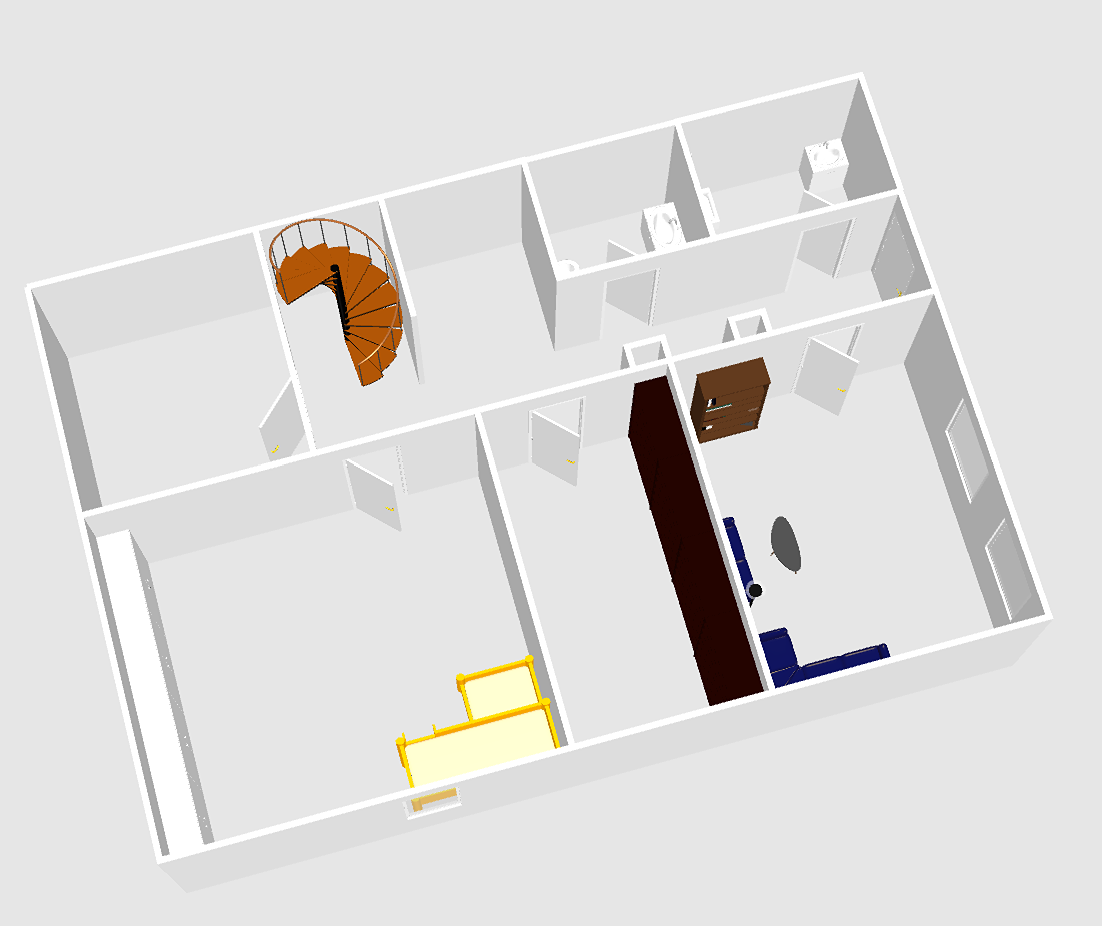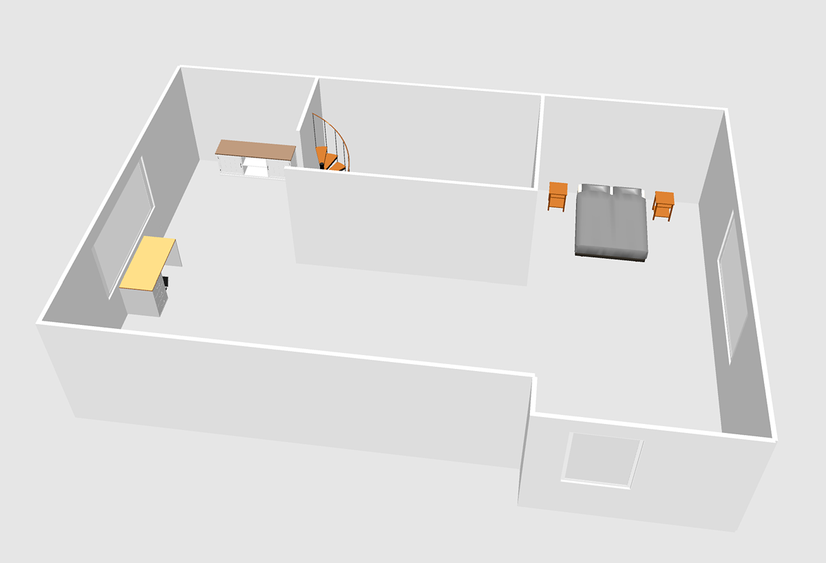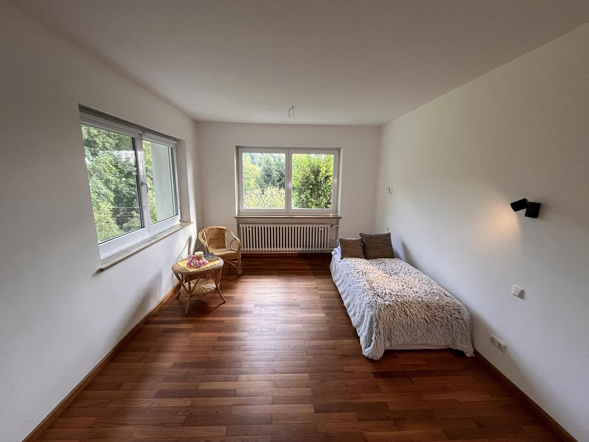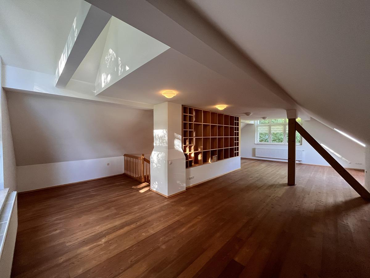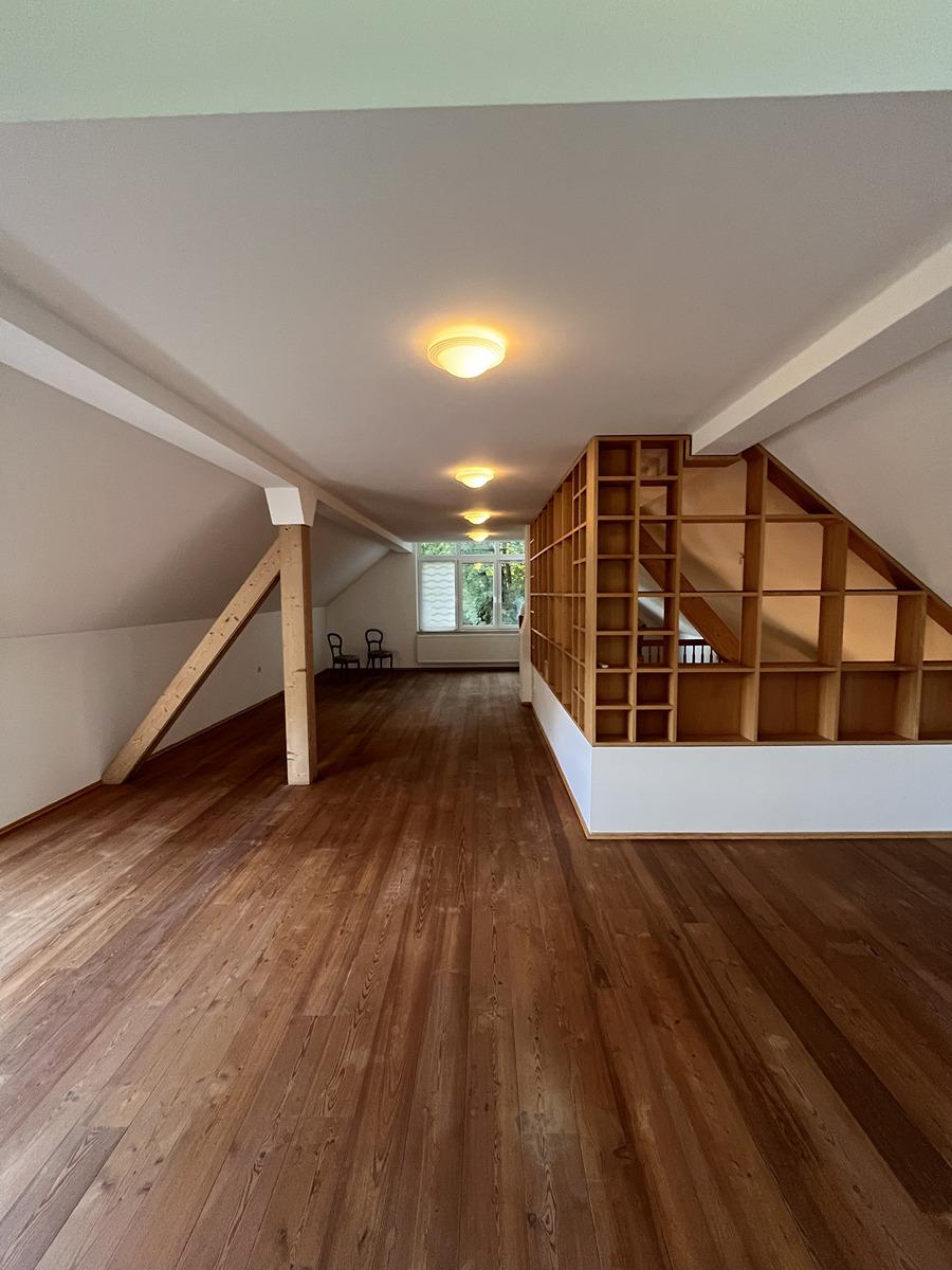Obergeschoss: Großzügiger Raum, der sich ideal in Arbeitszimmer, Ankleide und Schlafzimmer unterteilen lässt; große Fenster mit Blick ins Grüne