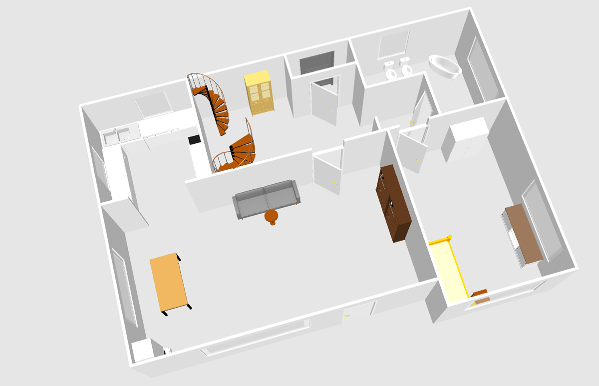 Erdgeschoss: Wohnzimmer, Küche mit Einbauküche, Schlafzimmer, Badezimmer mit Dusche und Badewanne, Windfang, Terasse mit Süd-Ausrichtung