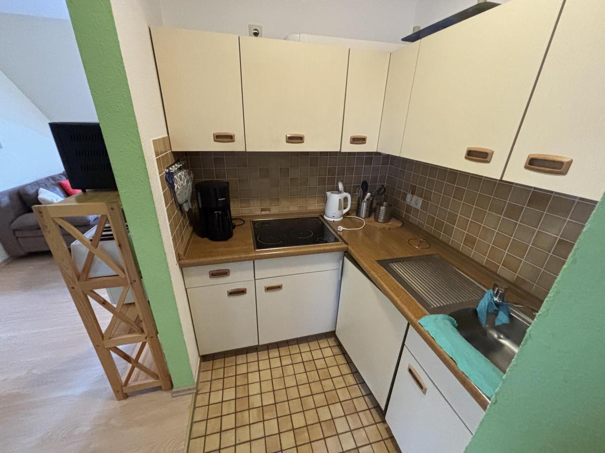 Die Wohnung ist komplett eingerichtet und ausgestattet. Die Küche verfügt über Zeranfeldherd, Spüle, Mikrowelle, Minibackofen und Kühlschrank, Dunstabzugshaube. In den Wohnbereichen ist Laminatbodenbelag vorhanden, der Küchenbereich und das Badezimmer sind gefliest.