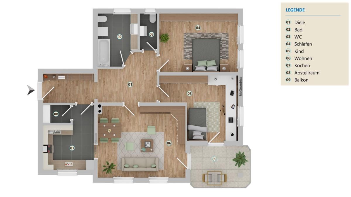 Der Eingangsbereich, Küchenbereich sowie das Badezimmer sind mit pflegeleichten und zeitgemäßen hellen Fliesenböden ausgestattet. Das Wohnzimmer und die Schlafbereiche sind dagegen mit hellem Laminat ausgelegt.