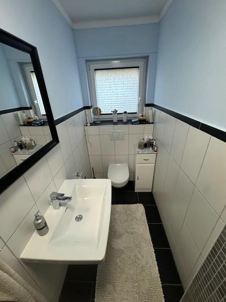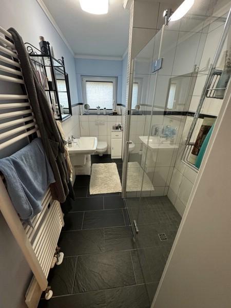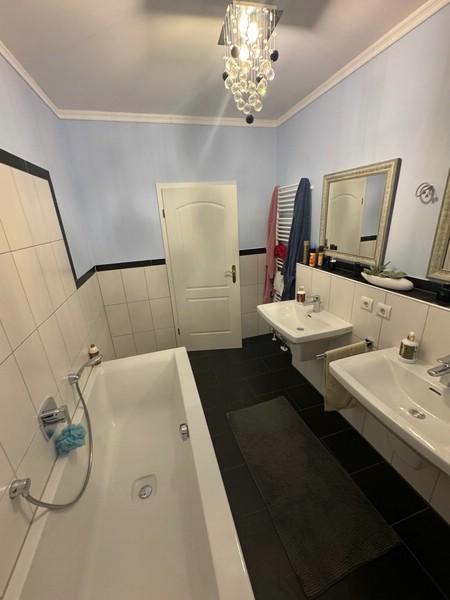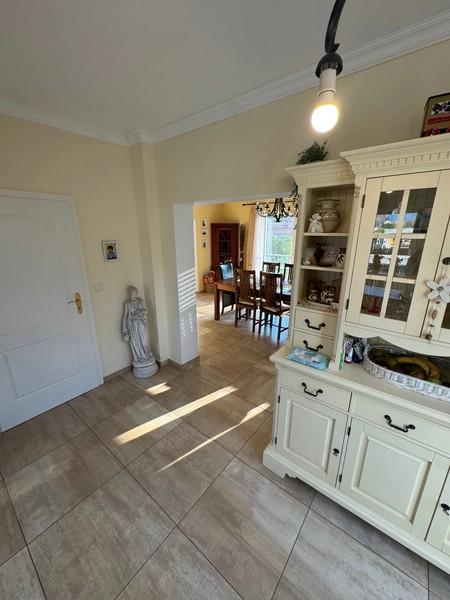 Beim Betreten des Hauses gelangen Sie in eine großzügige Diele mit einem speziell angefertigten Schuhschrank. Rechts führt eine Treppe in das Obergeschoss, während sich auf der gegenüberliegenden Seite der Zugang zum Kellergeschoss befindet. Auf der linken Seite liegt ein Büro, das sich ideal als Arbeits- oder Gästezimmer nutzen lässt. Direkt daneben befindet sich das Badezimmer, das mit einer Badewanne, einem WC, zwei Waschbecken sowie einem Fenster ausgestattet ist.