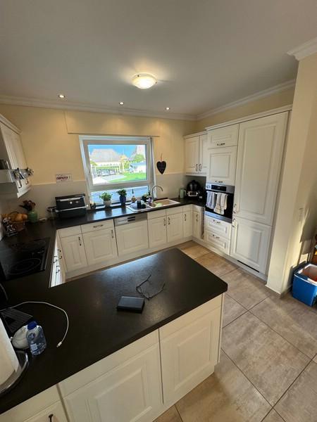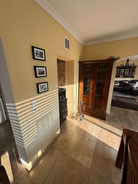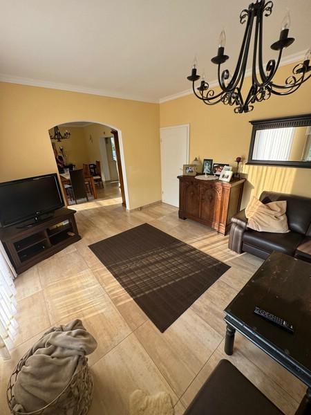 Geradeaus gelangen Sie vom Flur in den großzügigen Wohnbereich, der mit einem Kaminofen ausgestattet ist. Wohnzimmer, Esszimmer und Küche sind durch Rundbögen miteinander verbunden, wodurch die Räume optisch ineinander übergehen, aber dennoch voneinander getrennt bleiben. Vom Wohnbereich aus führen zwei Balkontüren auf einen großen Balkon, der einen schönen Ausblick in den Garten bietet. Die moderne Einbauküche bietet viel Platz zum Kochen und Arbeiten und hat einen direkten Zugang in den Flur.
