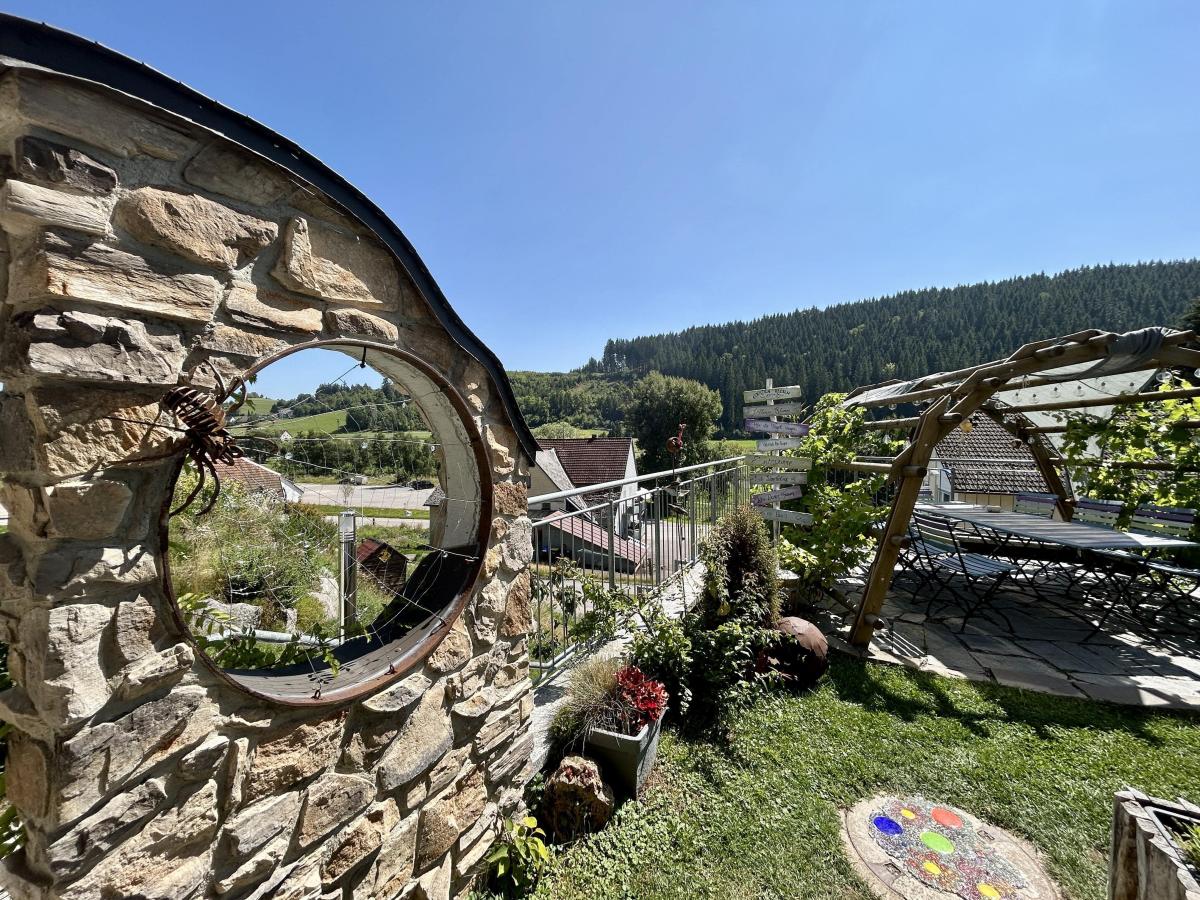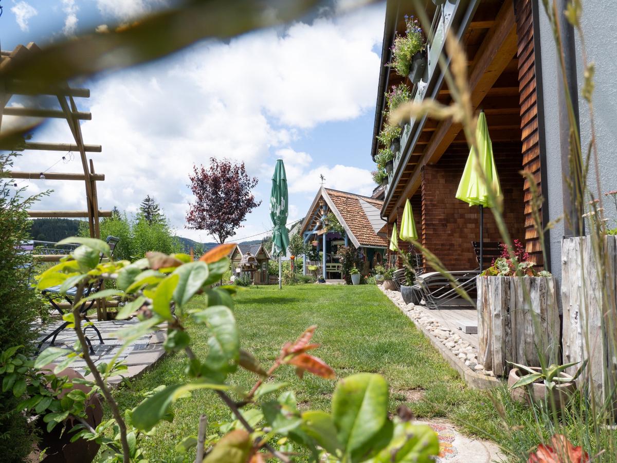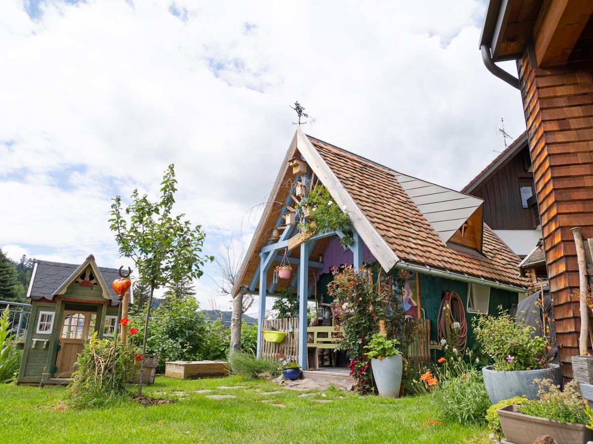 Besonderes Highlight ist der liebevoll angelegte Garten mit farbenfrohen Gartenhäuschen und einem überdachten Freisitz, von dem aus Ihre Gäste einen traumhaften Panoramablick über die Landschaft genießen können.