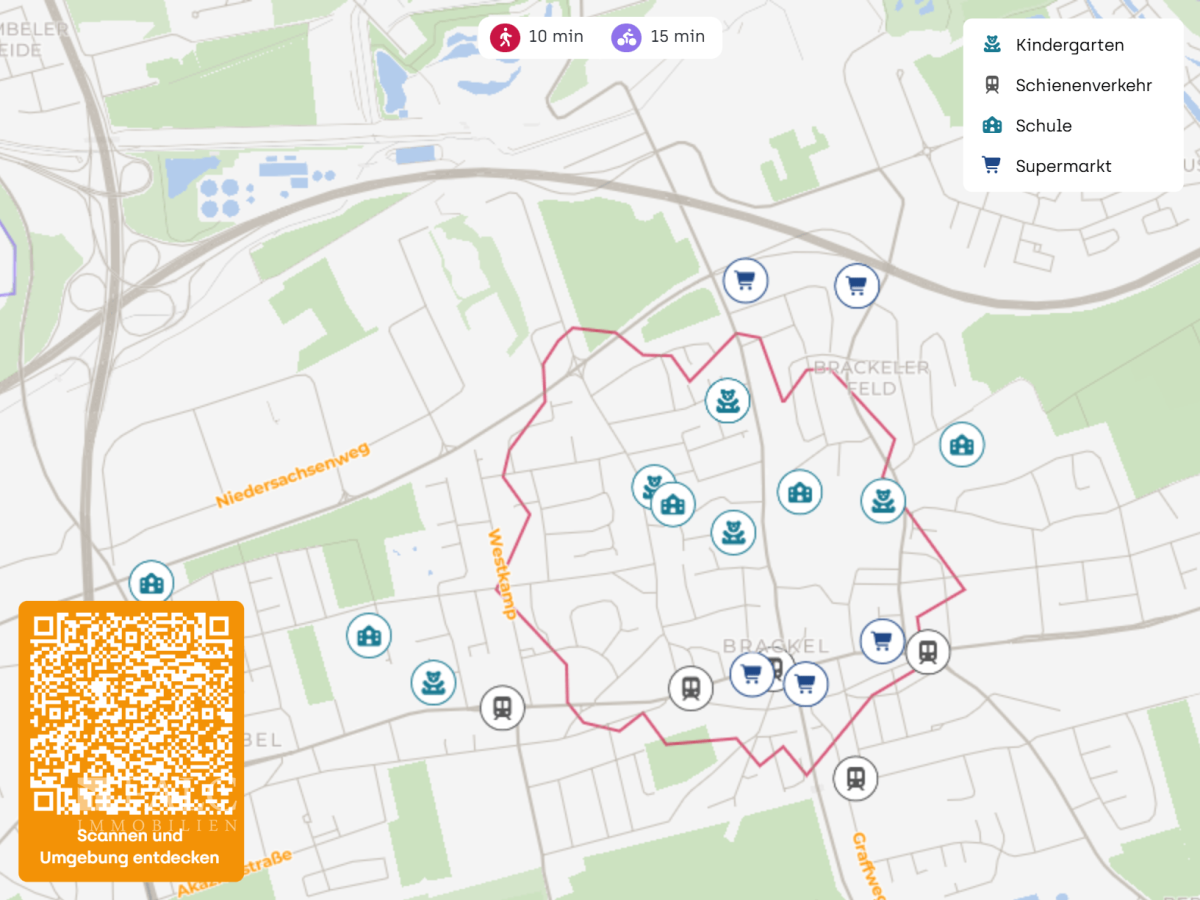 Brackel selbst ist einer der beliebteren Vororte von Dortmund. Es gibt verschiedene Einkaufsmöglichkeiten, die mit dem Auto, Fahrrad oder fußläufig zu erreichen sind: einen Biosupermarkt, Edeka, Rewe, Lidl, Aldi und weitere viele Fachgeschäfte. Sie finden in Brackel Ärzte der verschiedenen Fachrichtungen, Apotheken, eine Bibliothek und das wunderbares Kulturzentrum „Balou“. Schnell erreichbar sind in der Nähe verschiedene Kindergärten und Schulen.