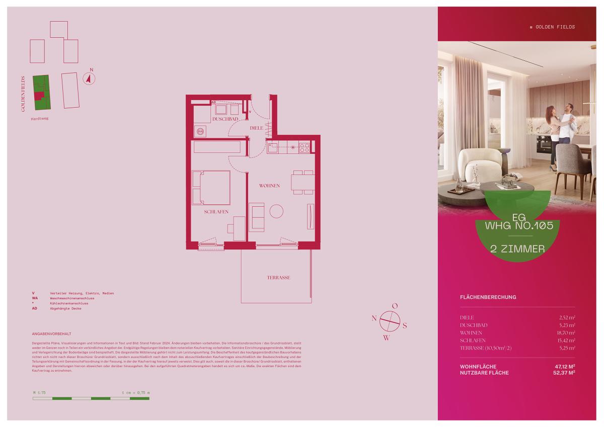 Diese kompakte 2-Zimmer-Wohnung punktet mit cleverer Aufteilung und einer großen, nach Westen ausgerichteten Terrasse – der perfekte Ort für entspannte Stunden in der Abendsonne. Das Schlafzimmer bietet genug Raum für Schrank und Bett während der offene Wohnbereich mit integrierter Küche und gemütlicher Mediaecke für ein modernes, wohnliches Ambiente sorgt. Das stilvolle Bad mit bodengleicher Dusche und praktischem Waschmaschinenanschluss rundet das durchdachte Wohnkonzept ab.