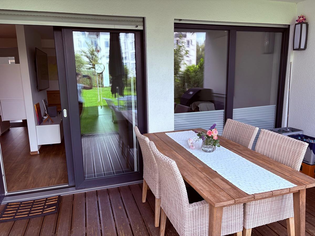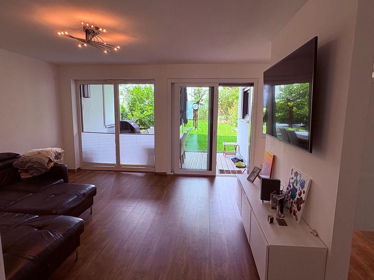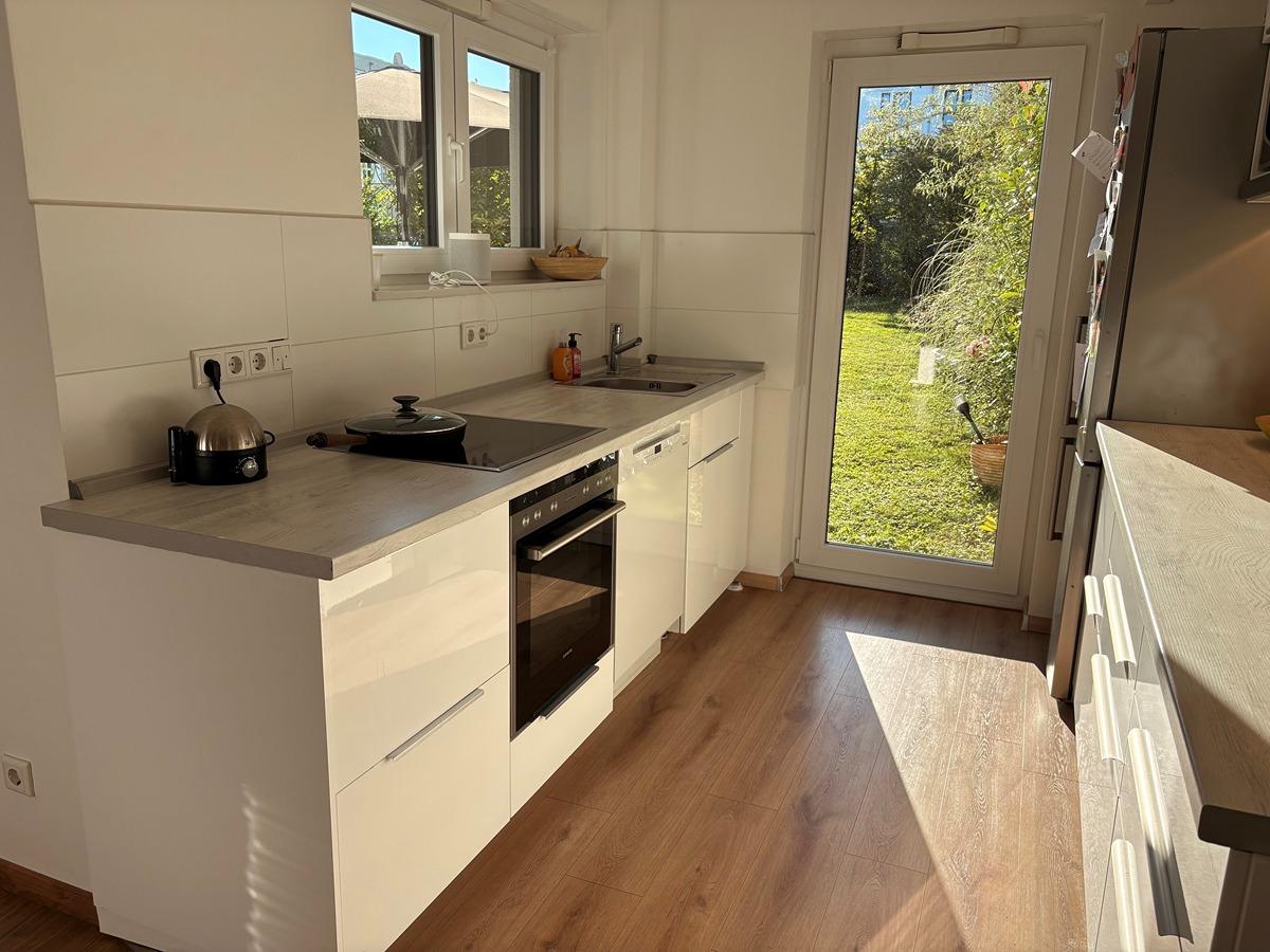 Im Herzen des Zuhauses befindet sich die Einbauküche, perfekt für gemeinsames Kochen mit Familie und Freunden. Von hier aus – ebenso wie aus dem Wohnzimmer mit bodentiefen Fenstern – gelangen Sie direkt in den privaten großen ca. 300qm großen Garten. Dort erwartet Sie eine großzügige, überdachte Terrasse, ideal zum Entspannen, Grillen oder gemütlichen Zusammensitzen zu jeder Jahreszeit.