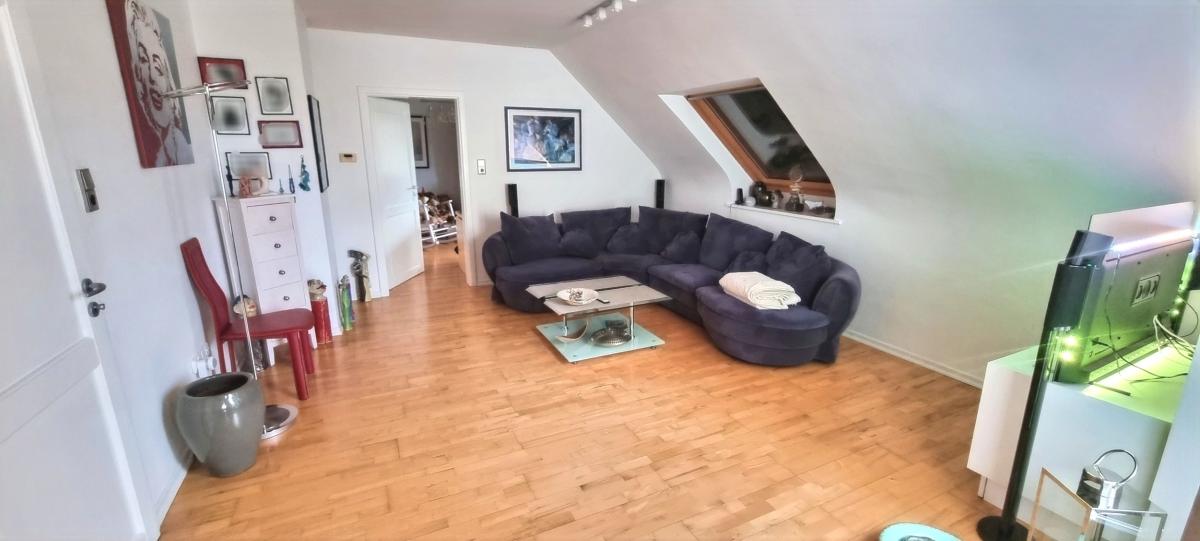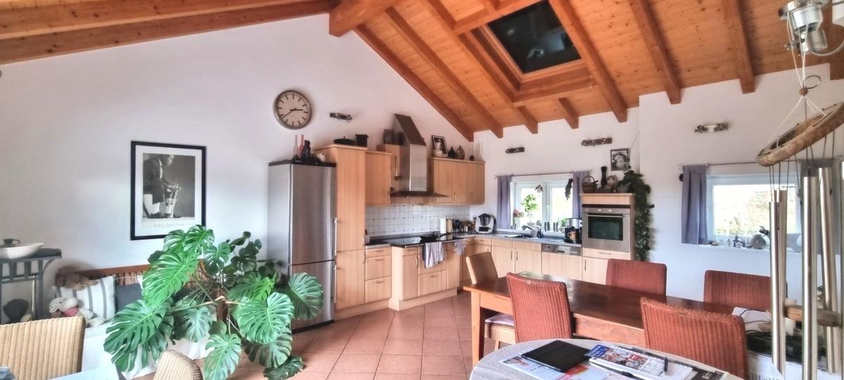 - einen offenen Wohn-/Essbereich mit teilweise freiem Blick bis unter das Dach