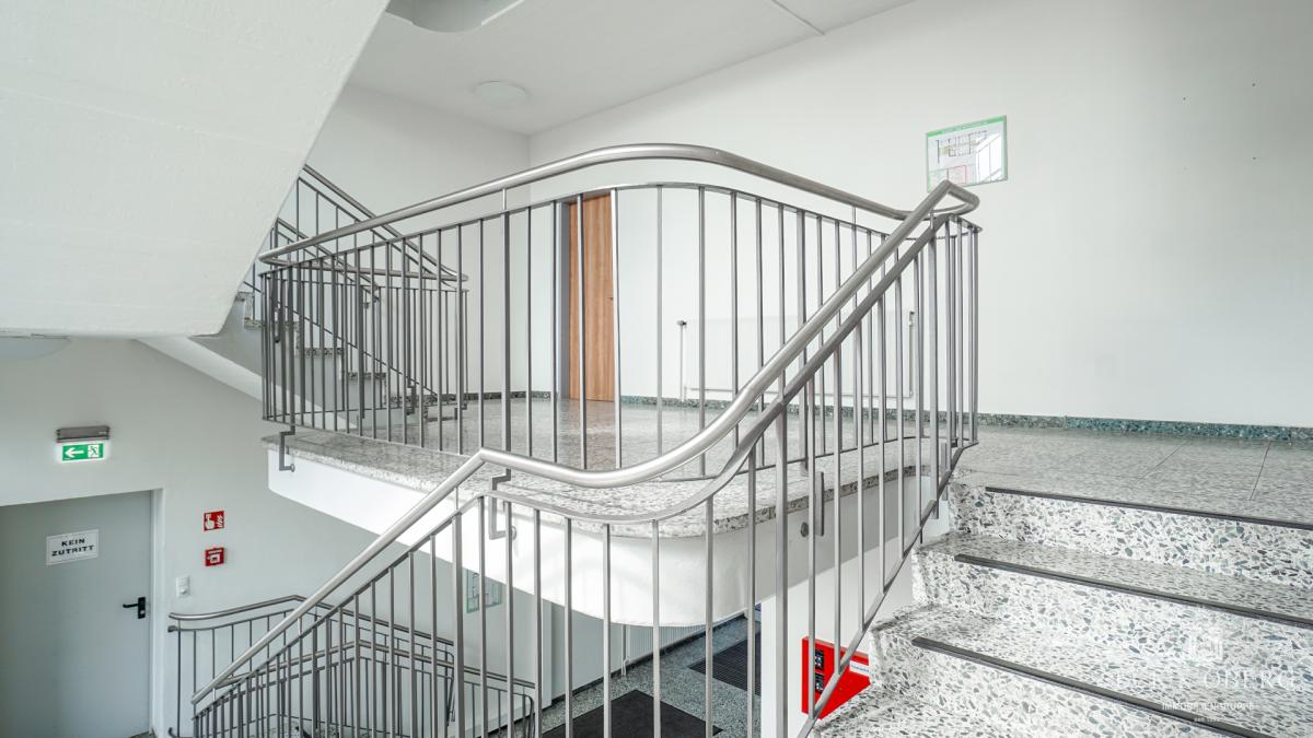 Für Komfort und Funktionalität ist bestens gesorgt: Es stehen separate Damen- und Herren-WCs sowie eine Einbauküche zur Verfügung. Darüber hinaus bietet das Objekt drei Außenstellplätze (jeweils 60 € monatlich) für Mitarbeiter oder Besucher. Die Räumlichkeiten sind über ein gepflegtes Treppenhaus erreichbar und befinden sich in einem repräsentativen Umfeld mit weiteren Gewerbemietern.