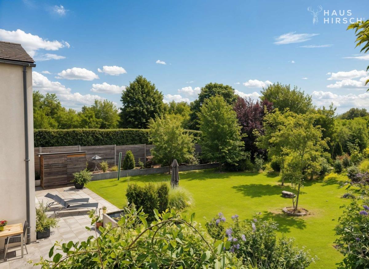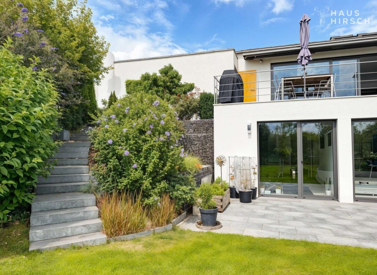 Eine elegante Treppe geleitet Sie hinunter in den weitläufigen Garten. Hier, auf rund 700 m² unbebauter Fläche, lässt sich Ihre Vision vom perfekten Outdoor-Leben verwirklichen – ob exklusiver Pool, edle Außensauna oder einfach ein Rückzugsort im Grünen.