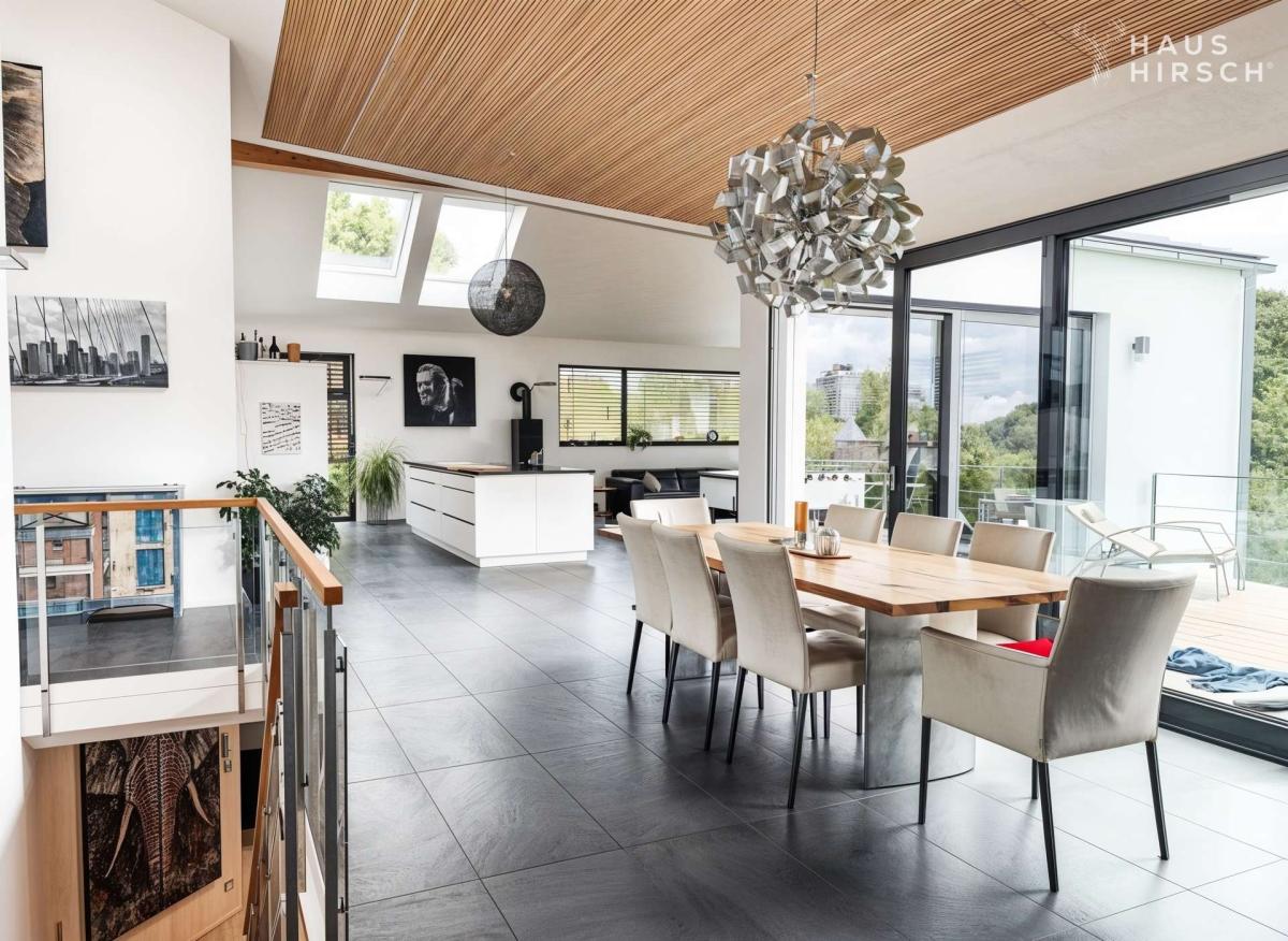 Bereits beim Betreten eröffnet sich Ihnen im oberen Geschoss ein lichtdurchfluteter Wohn-, Ess- und Küchenbereich, der in seiner Gestaltung sowohl Großzügigkeit als auch Wärme ausstrahlt. Im Inneren erwarten Sie über zwei Etagen insgesamt 300 m². Feinste Materialien, edle Oberflächen und ein durchdachtes Raumkonzept schaffen eine Atmosphäre, in der man nicht nur wohnt, sondern lebt. Bodentiefe Fenster führen direkt hinaus auf die großzügige Terrasse – Ihr erster Blick am Morgen fällt über Ihren privaten, parkähnlichen Wohnsitz, ein grünes Paradies, das Freiheit und Geborgenheit vereint. Der ebenerdige Zugang sowohl aus dem Haus als auch von der Doppelgarage mit knapp 50 m2 macht diesen Bereich zum Herzstück des täglichen Lebens.