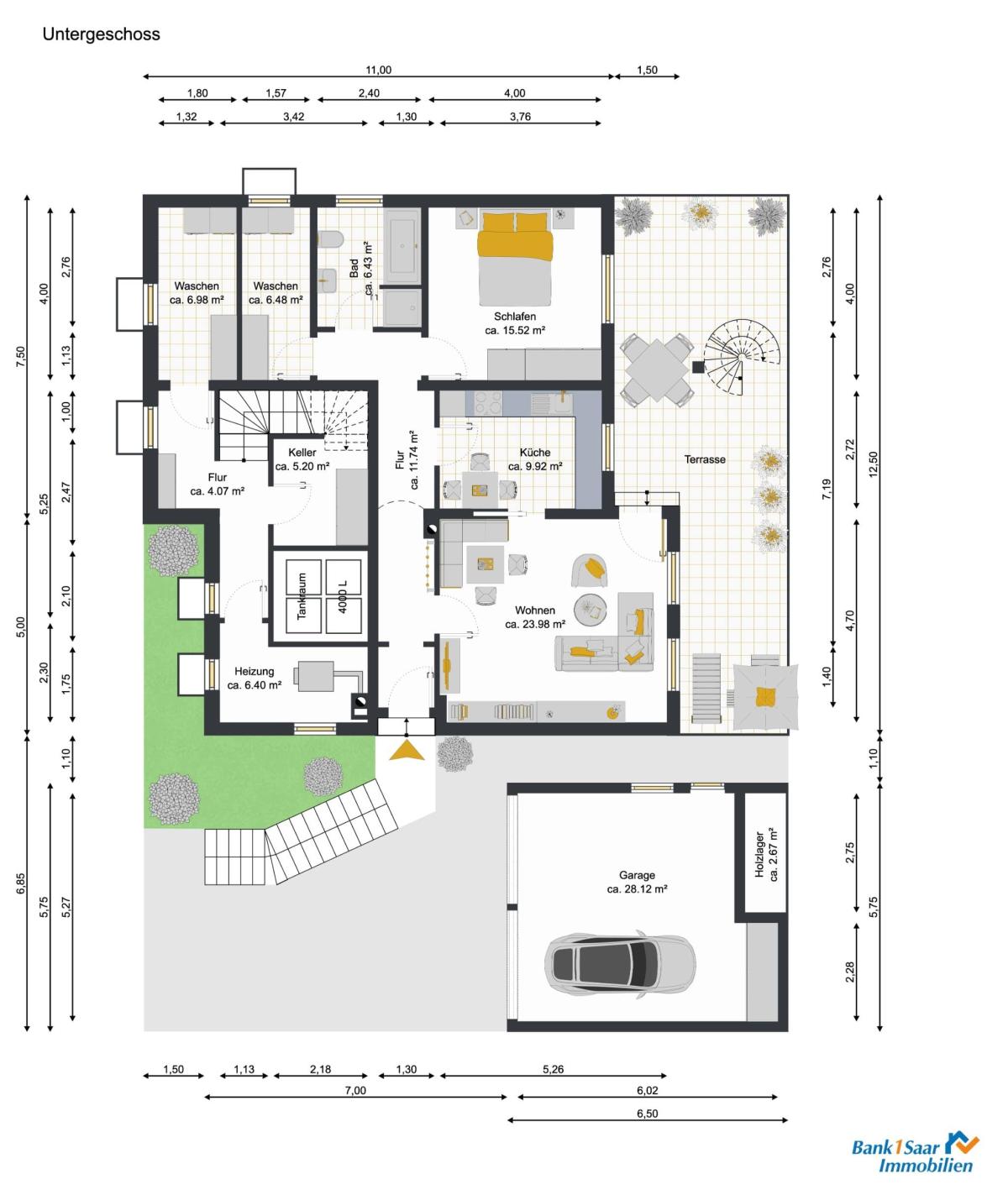 Die Garage ist voll unterkellert und bietet dadurch zusätzlichen Stau- und Lagerraum beispielsweise für Gartengeräte.