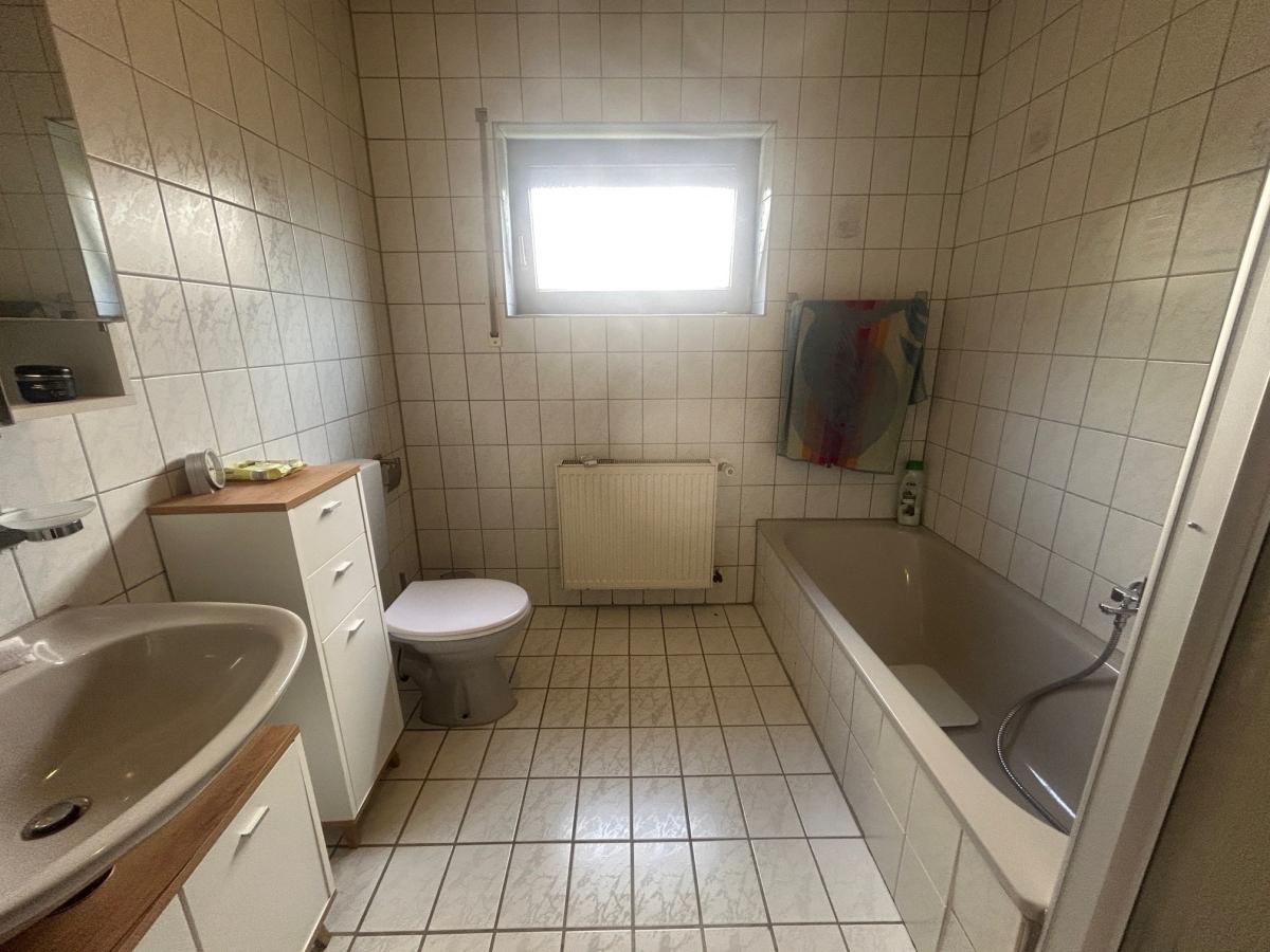 Flur, großes Wohn-Esszimmer mit Zugang zu Terrasse und Garten hinter dem Haus, separate Küche, Schlafzimmer, Tageslichtbad mit Wanne und Dusche, Hauswirtschaftsraum