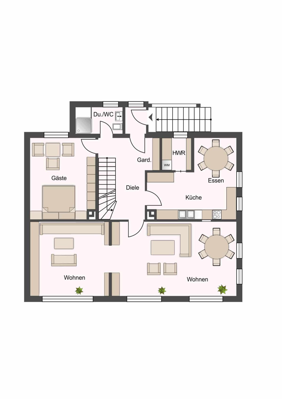 Im Erdgeschoss befindet sich ein großes Wohnzimmer, ein Esszimmer, ein Gästezimmer und eine geräumige Wohnküche, ein Bad mit Dusche sowie ein Gäste- WC.