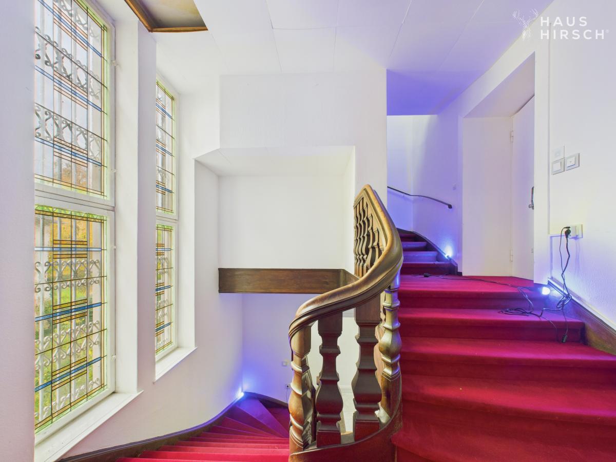 Betreten Sie das Anwesen und lassen Sie sich von den originalen Kassettendecken, den farbigen Bleiglasfenstern und der zentralen Holztreppe verzaubern, die mit modernster Technik wie neuer Gasheizung, hochwertigen Edelstahlleitungen und einem BUS-System über drei Etagen harmonisch ergänzt wurden.