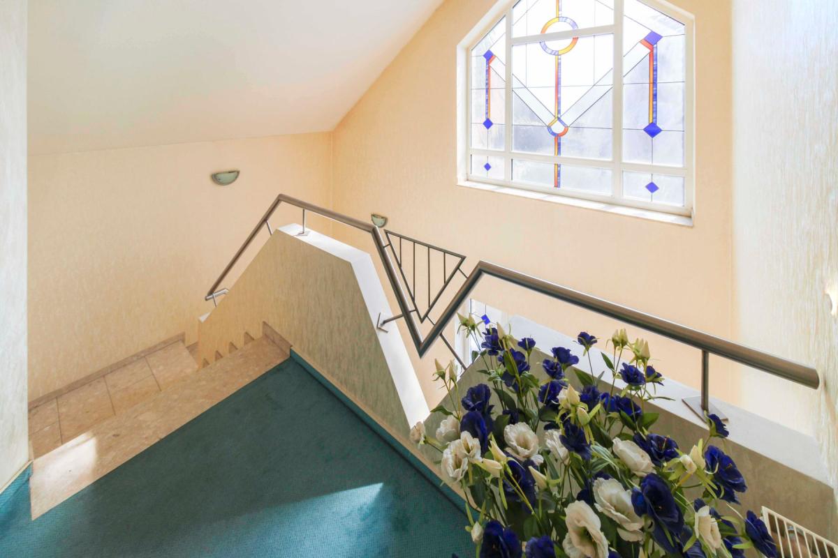 Im Erdgeschoss, finden sich neben dem besonders gestalteten Eingangsbereich mit großen, farbigen Fenstern, ein großer Wohn- und Essbereich (ca. 47 m²) mit bodentiefen Fenstern sowie Zugang zum Garten und zur Terrasse. Die große Fensterfront bietet einen tollen Ausblick ins Grüne. Weiter ist hier eine Küche mit Einbauküche aus 2001, ein Gäste-WC sowie ein Garderobenbereich mit Zugang zur Garage vorhanden. Das Erdgeschoss ist mit einer Fußbodenheizung ausgestattet. Vorhanden ist ebenfalls eine automatisierte Zisterne mit einem Fassungsvermögen von 10.000 Liter zur Bewässerung der Außenanlagen und der Toiletten. Es muss keine Abwassergebühr für bebaute Flächen entrichtet werden, da die Zisterne das gesamte Regenwasser auffängt.