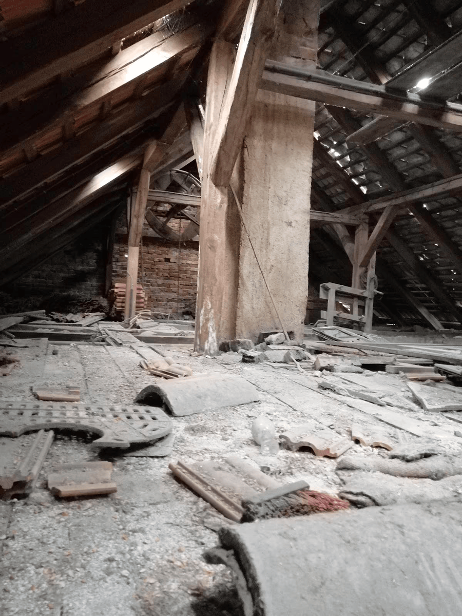 Das Dach hat 3 Teileindeckungen: Wellasbest, Betonziegel und Tonziegel.