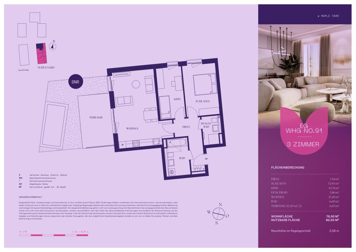 Nicht nur innen, auch draußen zeigt diese 3-Zimmer-Wohnung im Erdgeschoss ihre ganze Stärke: Auf ca. 76,00 m² verbindet sie klare Architektur mit einer großzügigen Terrasse, die den Wohnraum ins Grüne verlängert. Das Herzstück bildet der weitläufige Wohn- und Essbereich mit Platz für eine Küche – lichtdurchflutet und offen zum Außenbereich. Zwei Schlafzimmer, flexibel nutzbar für Familie, Gäste oder Arbeiten von Zuhause, bieten private Rückzugsorte. Zwei moderne Bäder – eines mit Wanne, eines als Duschbad – verleihen dem Grundriss Komfort und Alltagstauglichkeit. Ein Zuhause, das Offenheit mit Intimität verbindet und die Natur zum festen Bestandteil des Wohnens macht – im FVTVRIA Mapleyard.