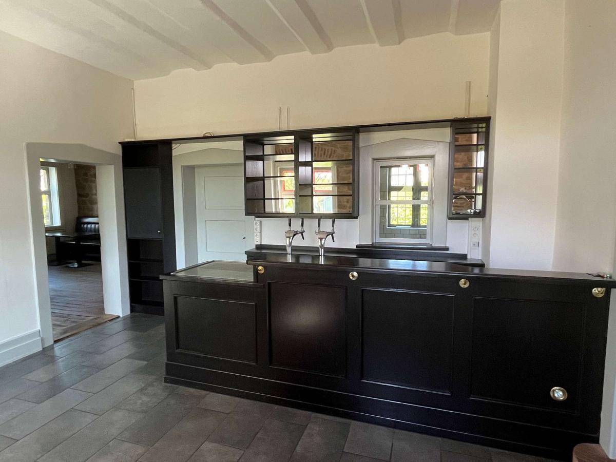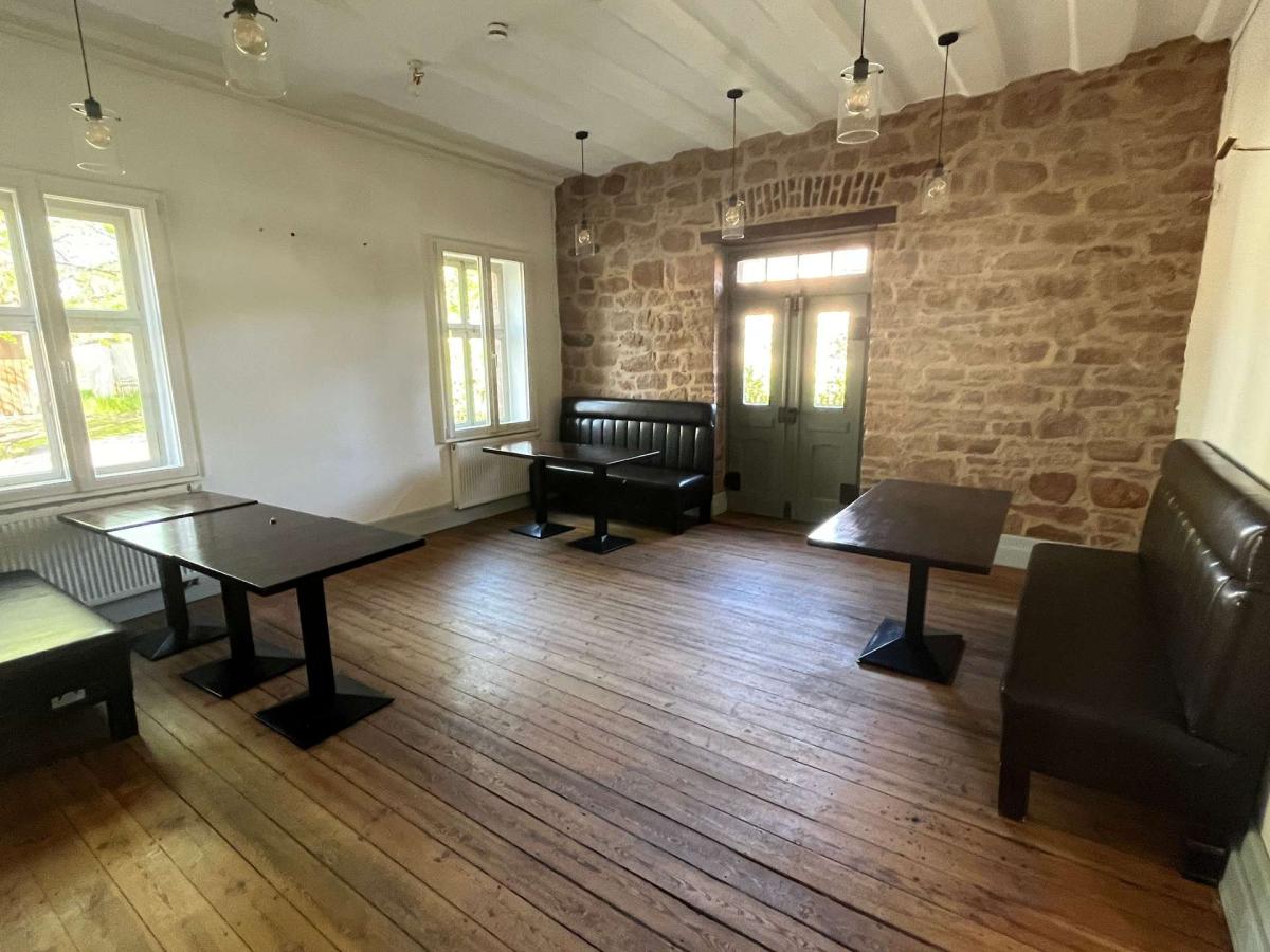 Im Erdgeschoss befinden sich zwei großzügige, lichtdurchflutete Gasträume mit hohen Decken und großen Fenstern, die ein offenes und angenehmes Raumgefühl schaffen. Der Thekenbereich und die Anschlüsse sind vorhanden. Ein restaurierter Kaminofen bildet das Herzstück der Räumlichkeiten und verleiht dem Innenbereich insbesondere in der kälteren Jahreszeit eine besondere Atmosphäre.