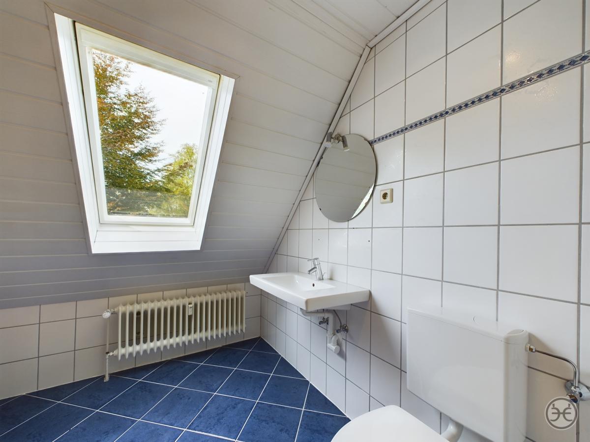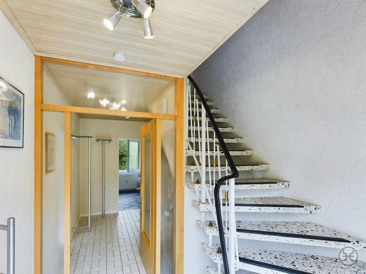 Von der Küche aus gelangen Sie in einen gefliesten Flur, von dem aus Sie zum einen Zugang zum hinteren Garten, zum seitlichen Hauseingang mit angeschlossenem Gäste-Bad mit eigener Dusche und zum Hauswirtschaftsraum (HWR) mit angeschlossenem Hobby-Raum oder Arbeitszimmer haben. Im HWR steht Ihnen noch eine weitere Einbauküche zur Verfügung. Hier befindet sich auch der Zugang zum Keller. Dieser linke Erdgeschoss-Teil könnte dabei auch zum Beispiel als kleine Einliegerwohnung für einen älteren Jugendlichen oder für Pflegepersonal genutzt werden. Dieser seitliche Gebäudeanbau, in dem sich auch die Garage befindet verfügt über ein Flachdach. Das Flachdach wurde Ende der 90er Jahre neu isoliert und mit mehreren Lagen Bitumen-Bahnen abgedichtet. Im Bereich des Schornsteins ist es vor geraumer Zeit bei Starkregen zu einem kleinen Wasserschaden gekommen, das Flachdach müsste hier ggf. noch einmal neu abgedichtet werden.