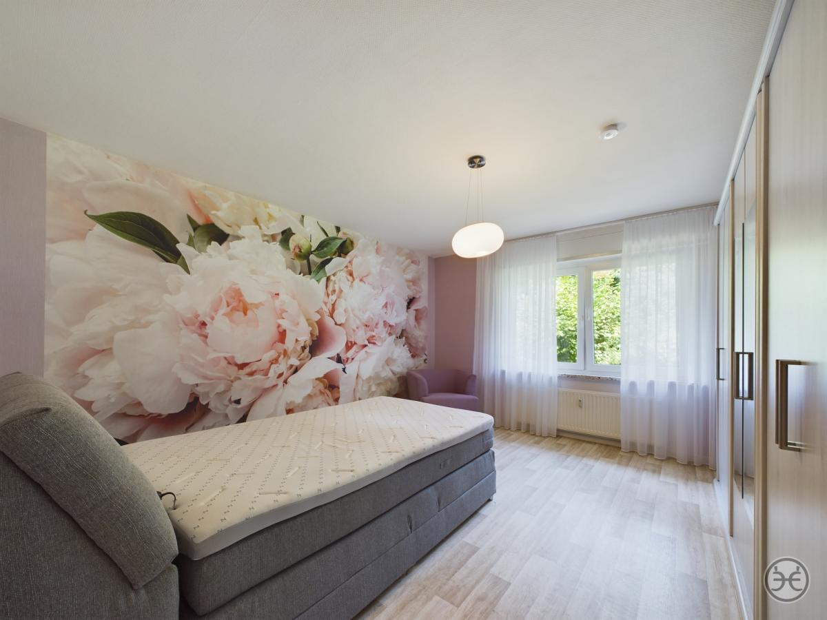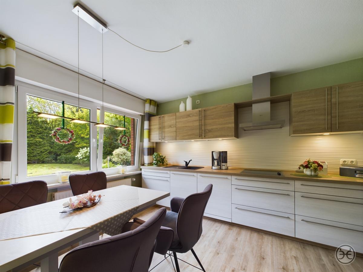 Im Erdgeschoss stehen Ihnen derzeit folgende Räume zur Verfügung: ein großzügiges Wohn- und Esszimmer mit wunderbarem Kamin (im Kaufpreis enthalten) und Vinylboden in Holzoptik, ein zentraler Flurbereich mit Fliesenboden, ein Schlafzimmer mit Vinylboden, ein weiteres Wohnzimmer oder 2. großes Schlafzimmer mit Laminatboden, ein Badezimmer mit bodengleicher Dusche, Waschtisch mit Spiegelschrank, WC, Handtuchwärmer mit Boden- und deckenhohen Wandfliesen, sowie eine Küche mit einer schönen Einbauküche (Neuwert ca. 6.000 Euro) aus 2019 mit NEFF-Geräten wie Dunstabzugshaube, Kühlschrank, Geschirrspüler und Backofen (unbenutzt) und entsprechenden Ober- und Unterschränken.