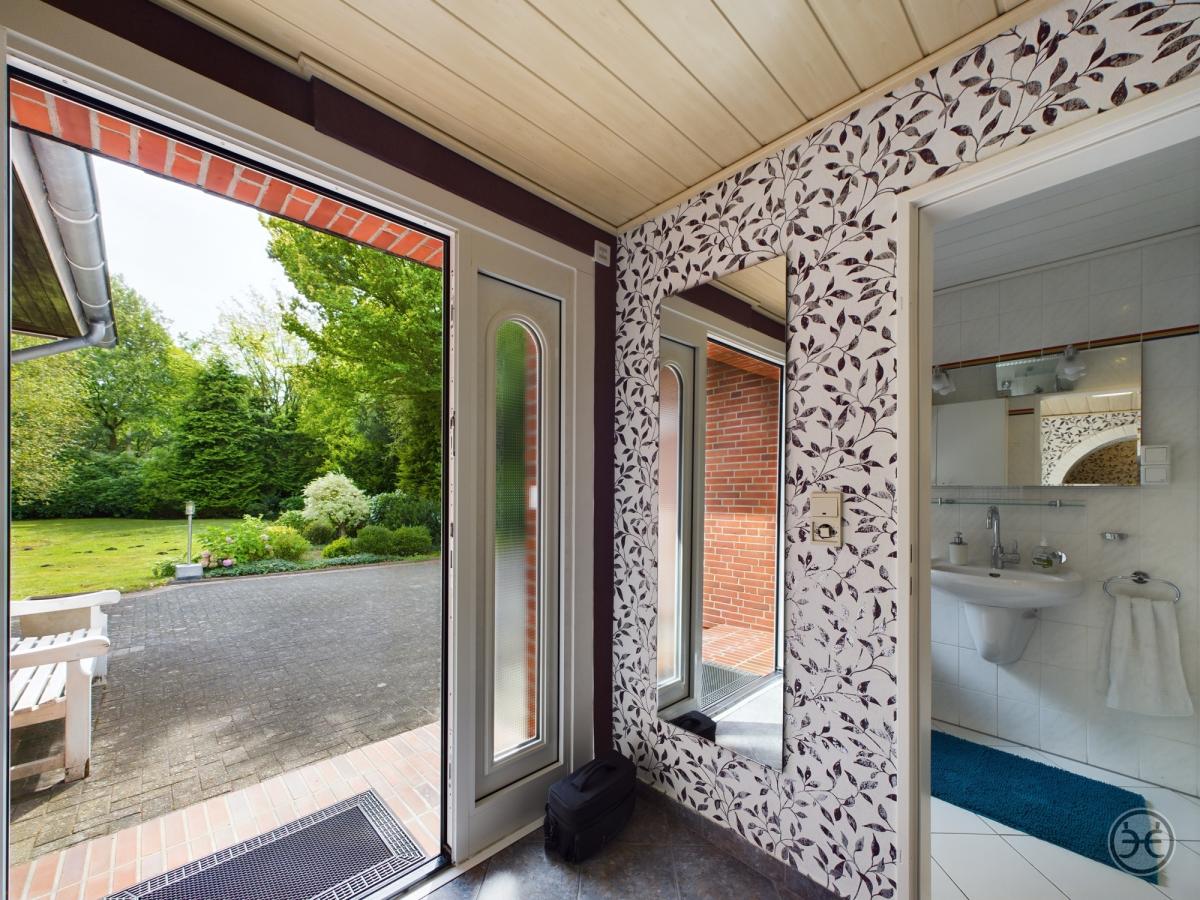 Sie erreichen das Haus über die Zufahrt von der Nordmoslesfehner Straße. Der vordere Grundstücksteil zur Straße besticht dabei mit einem sehr großen und hochgewachsenen Pflanzenbestand, der das Objekt fast uneinsehbar von der Straße macht.