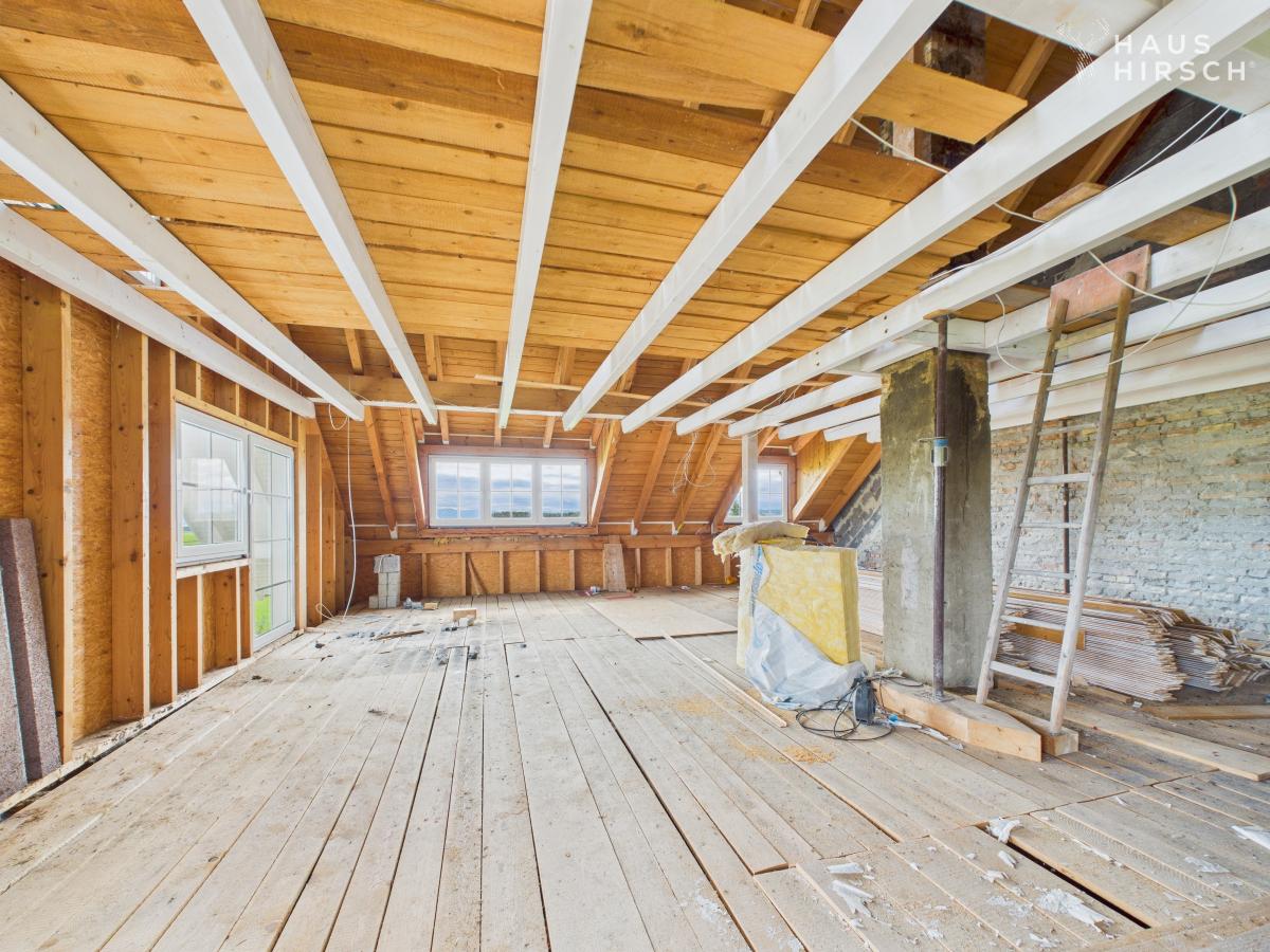 - Obergeschoss: eine 5,5-Zimmer-Wohnung auf zwei Ebenen (Maisonette) ist bereits ausgebaut, eine weitere Einheit (155m²) steht zum Ausbau bereit und bietet weiteres Potenzial