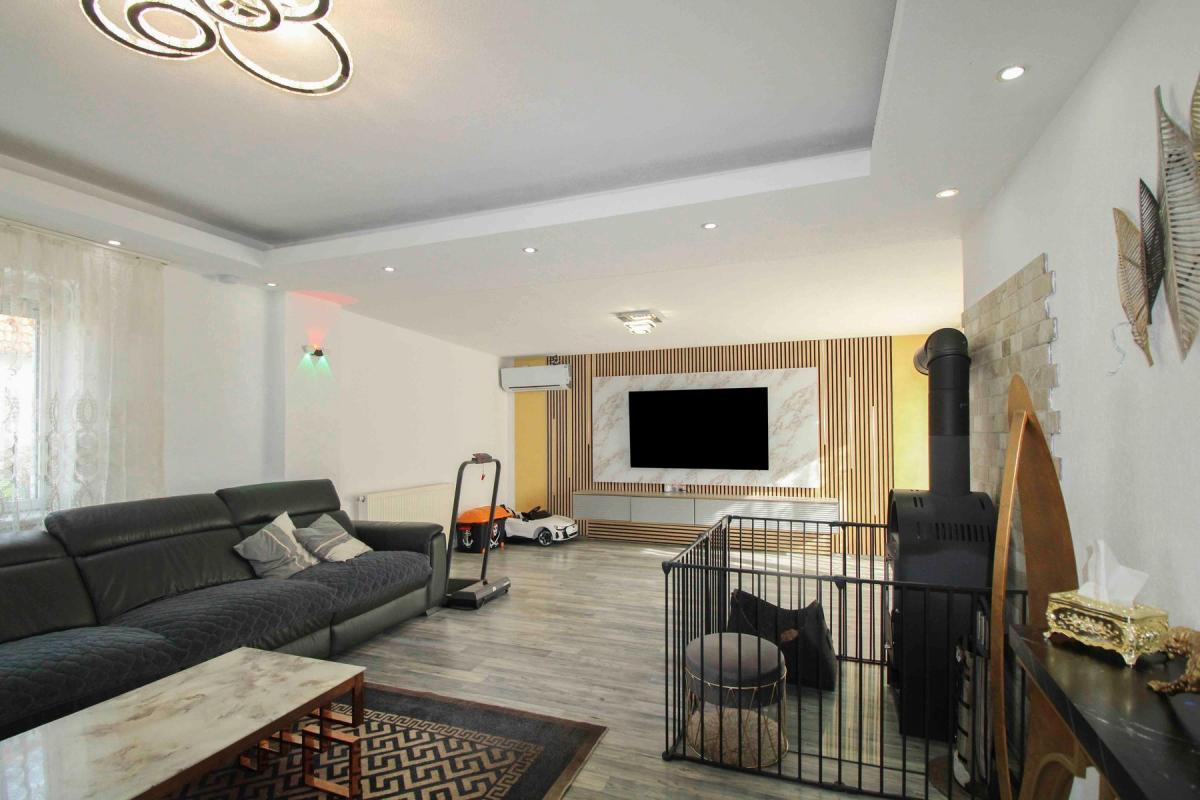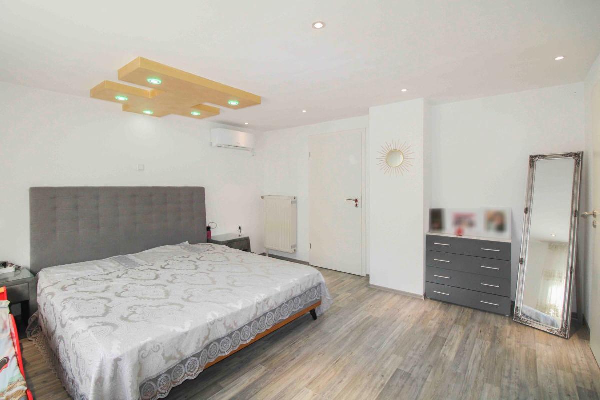 Im ersten Stock erwarten Sie drei weitere Schlafzimmer: das Hauptschlafzimmer mit einem kleinen Nebenraum, der sich ideal als begehbarer Kleiderschrank nutzen lässt, ein Kinderzimmer sowie ein weiteres Zimmer, das aktuell als Büro genutzt wird. Vom Büro und vom Kinderzimmer aus gelangen Sie auf die große Dachterrasse, die viel Platz zur Entspannung und zum Sonnenbaden bietet. Insgesamt stehen somit vier Schlafzimmer zur Verfügung, wodurch das Haus auch für Familien mit größerem Platzbedarf bestens geeignet ist.