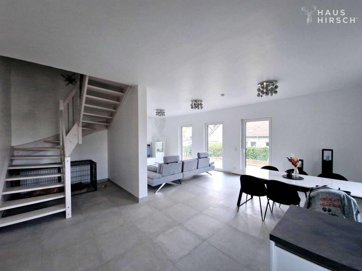 Schon beim Erreichen des Grundstückes fällt der wunderschöne Blick in die Ferne auf. Durch den liebevoll angelegten Vorgarten erreichen Sie die Haustür der rechten Haushälfte und betreten von dort aus das Haus durch den Flur, der ausreichend Platz für Ihre Garderobe bietet. Angrenzend an den Flur befinden sich ein Tageslicht Gäste-WC und der Hauswirtschaftsraum. Der großzügige Wohn-Essbereich mit offener Küche liegt im hinteren Teil des Hauses. Die Küche ist mit einer hochwertigen Einbauküche von Nolte ausgestattet. Über die weiß lasierte Echtholztreppe gelangen Sie ins Obergeschoss. Hier stehen 3 schöne Schlafzimmer und ein großes Bad mit Wanne und bodengleicher Dusche zur Verfügung. Die Wohnfläche dieser Wohneinheit beträgt 114 m² zzgl. ca. 8 m² Nutzfläche.