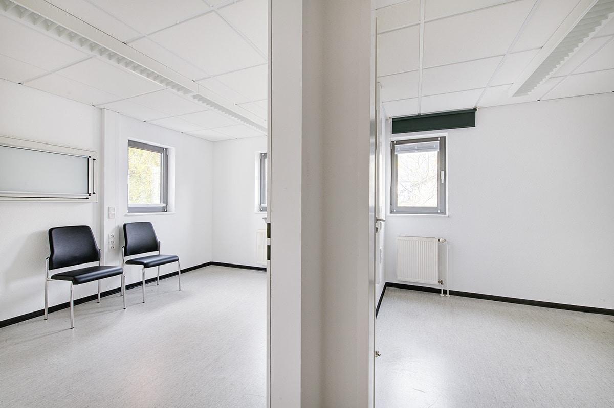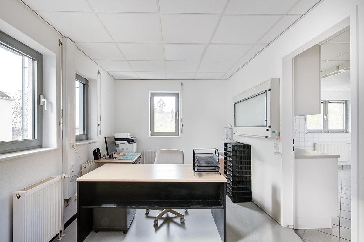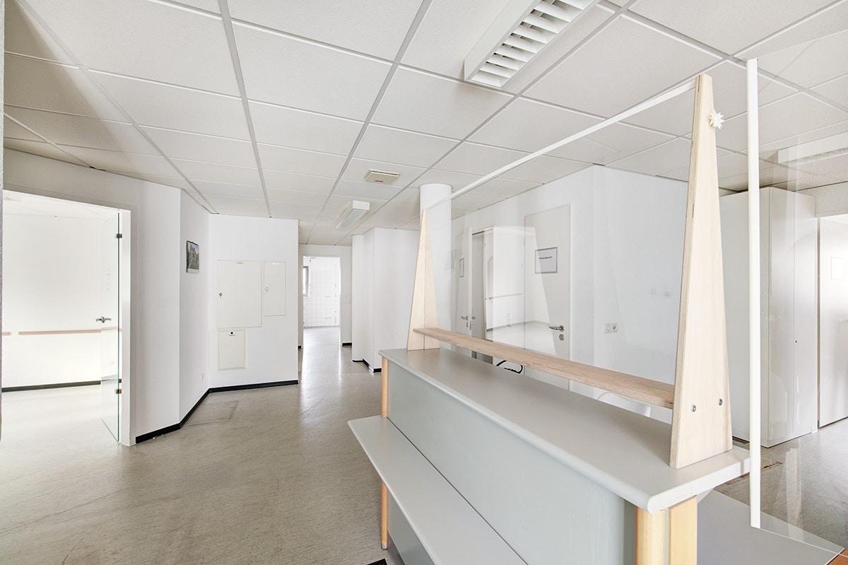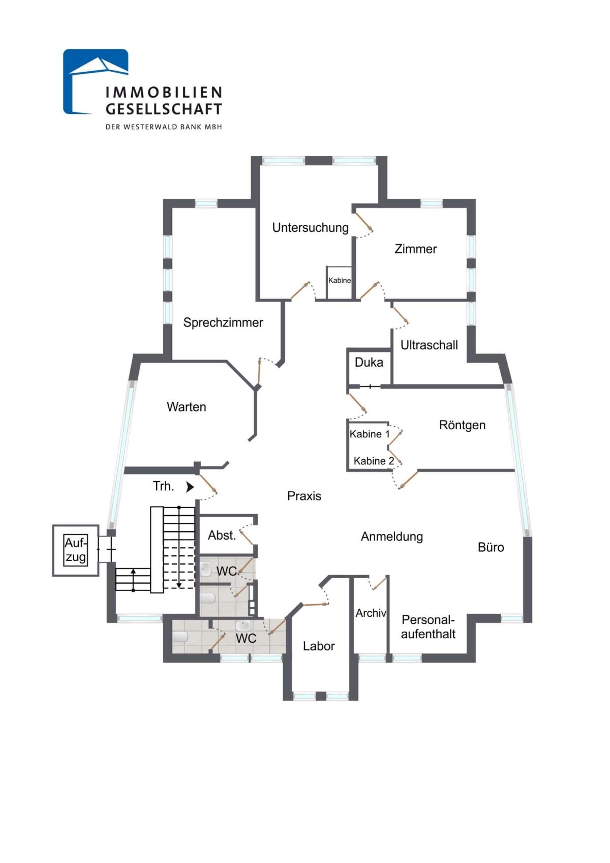 Im 1. Obergeschoß gelegen, stehen hier rd. 160 m² Fläche zu Ihrer Verfügung. Sowohl über das helle, freundliche Treppenhaus, als auch mit dem Aufzug angenehm zu erreichen, erschließt ein großzügiger Empfangsbereich mit Anmeldung und Büro die Räumlichkeiten. 4 Behandlungsräume, ein Röntgenraum, ein kleines Labor, Wartezimmer, Sanitäreinrichtungen, ein Personalraum und 2 Archivkammern stehen zur Verfügung, siehe hierzu bitte beigefügter Grundriss. Ein Archivraum befindet sich ergänzend im Kellergeschoß.