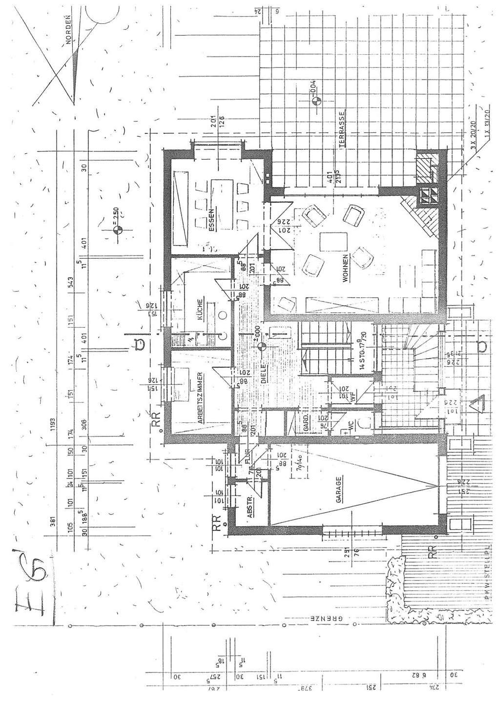 Im Erdgeschoss befinden sich: Der großzügige Dielen-/Eingangsbereich mit Gäste-WC, eine Garderobennische, ein Abstellraum, der Zugang zur Garage und zum Untergeschoss. Über die Diele erreichen Sie das separate Zimmer, die Küche mit EBK und den sehr großen und hellen Wohn-/Essbereich mit Zugang in den Garten bzw. auf die geschützte Terrasse.