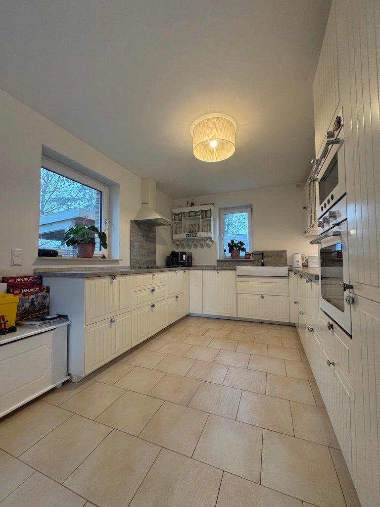 Die Raumaufteilung im Erdgeschoss besticht nach der grosszügigen Diele durch den sehr großen, lichtdurchfluteten Wohn-/Essbereich inkl. offener Küche mit direktem Zugang zu der Terrasse und dem Garten.