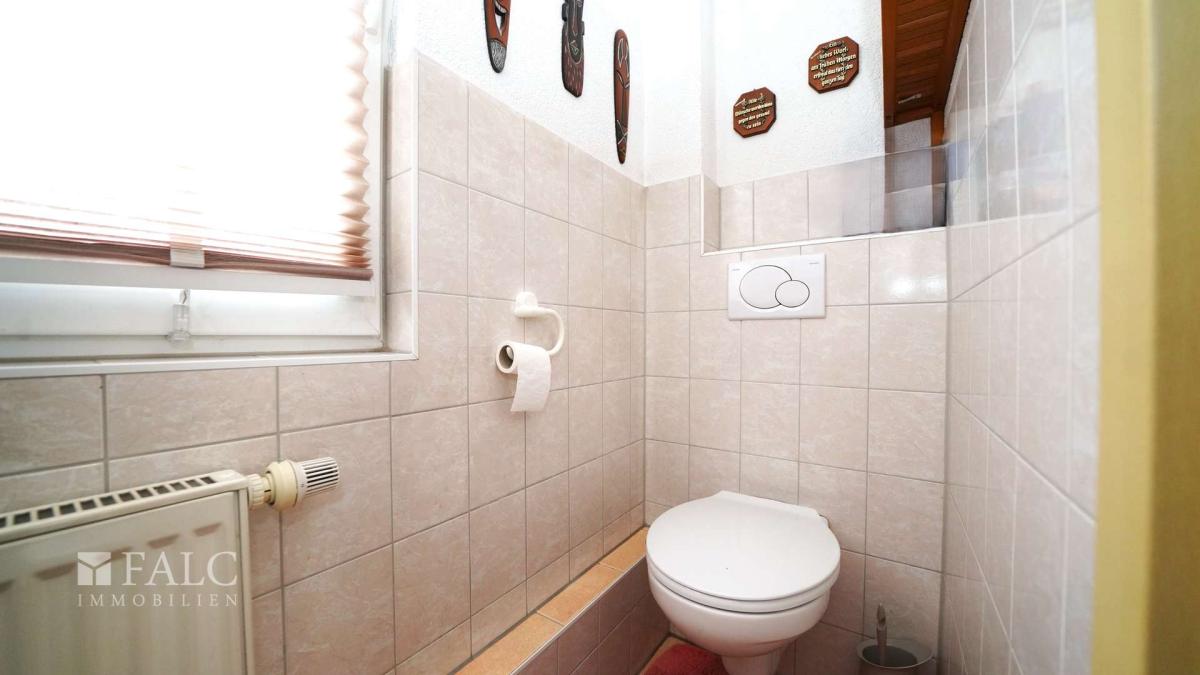 Auf jeder Etage befindet sich zudem ein separates Gäste-WC, jeweils mit Fenster und hellen, pflegeleichten Fliesen sowie einem Waschbecken ausgestattet.