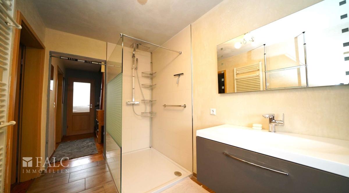 Über die stilvolle Holztreppe erreichen Sie das Obergeschoss, in dem überwiegend hochwertige Dielenböden verlegt sind. Das Highlight dieser Etage ist das 2018 komplett modernisierte Tageslichtbad, das sich direkt an das Hauptschlafzimmer anschließt. Dahinter erwartet Sie eine bodenflache Dusche mit eleganter Glastrennwand sowie ein ästhetisch abgestimmter Waschbereich mit reichlich Stauraum für Ihre Badutensilien. Im Bad sind außerdem Anschlüsse für Waschmaschine und Trockner vorhanden.