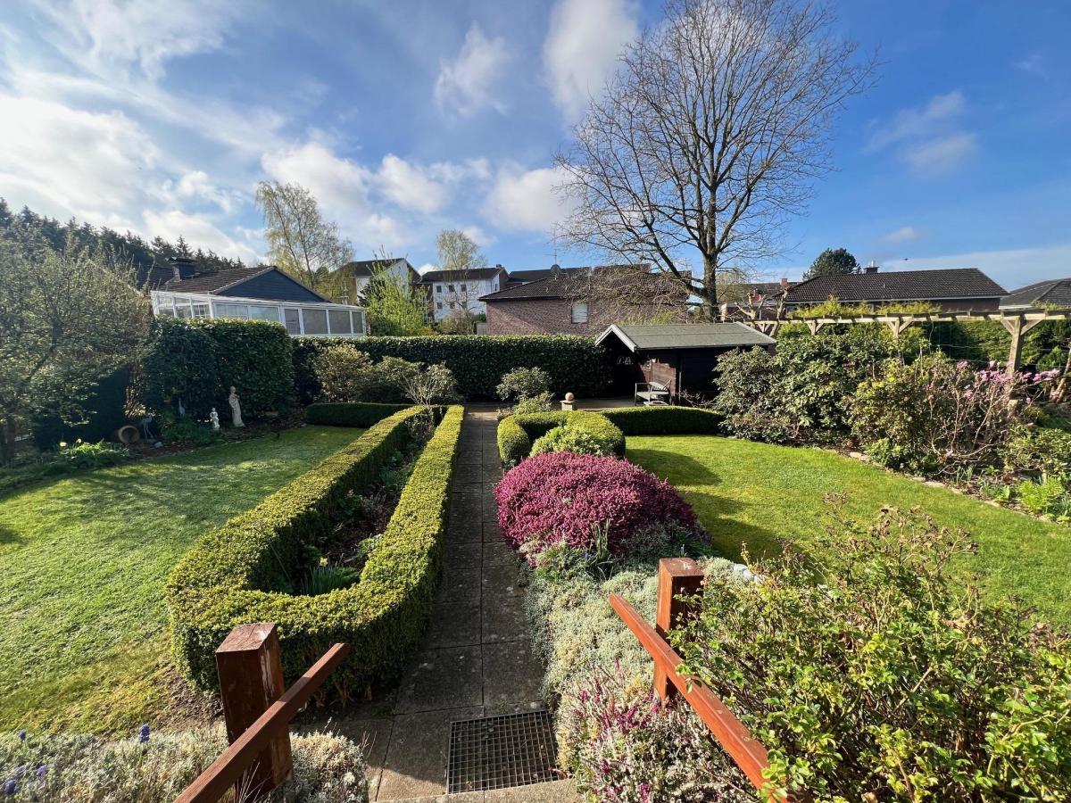 Der liebevoll angelegte Garten mit gepflegten Grünflächen lädt zum Entspannen ein. Ein geräumiges Gartenhaus bietet zahlreiche Nutzungsmöglichkeiten, ob als Hobbyraum, Atelier oder persönlicher Rückzugsort.