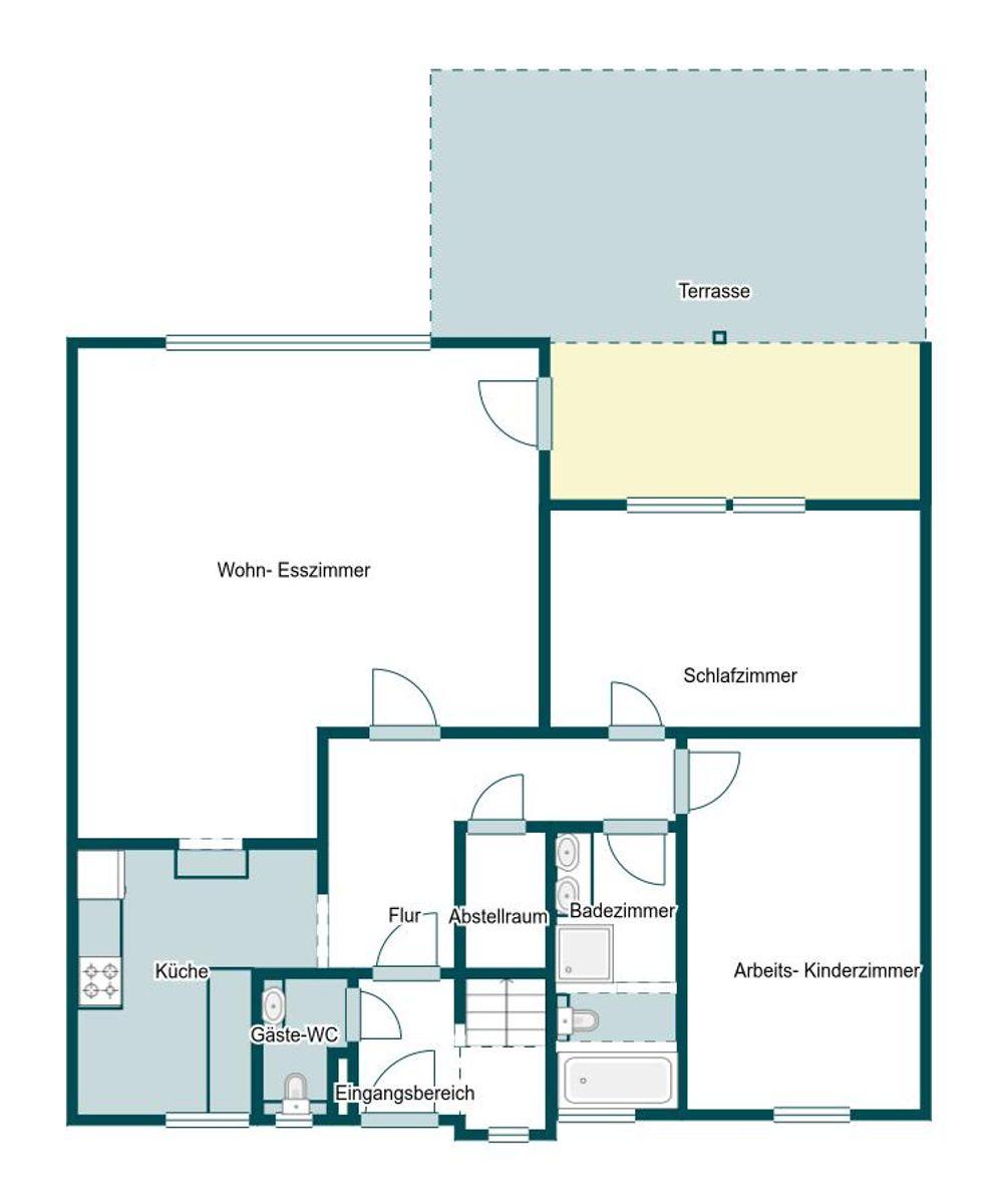 Verteilt liegen die rund 120 m² Wohnfläche auf zwei Ebenen und insgesamt 4 Zimmer. Daneben stehen ein Badezimmer mit Dusche und Badewanne sowie ein Gäste-WC in der Immobilie bereit. Die Ausstattung mit einer Einbauküche erleichtert den zukünftigen Bewohnern den Alltag. Eine