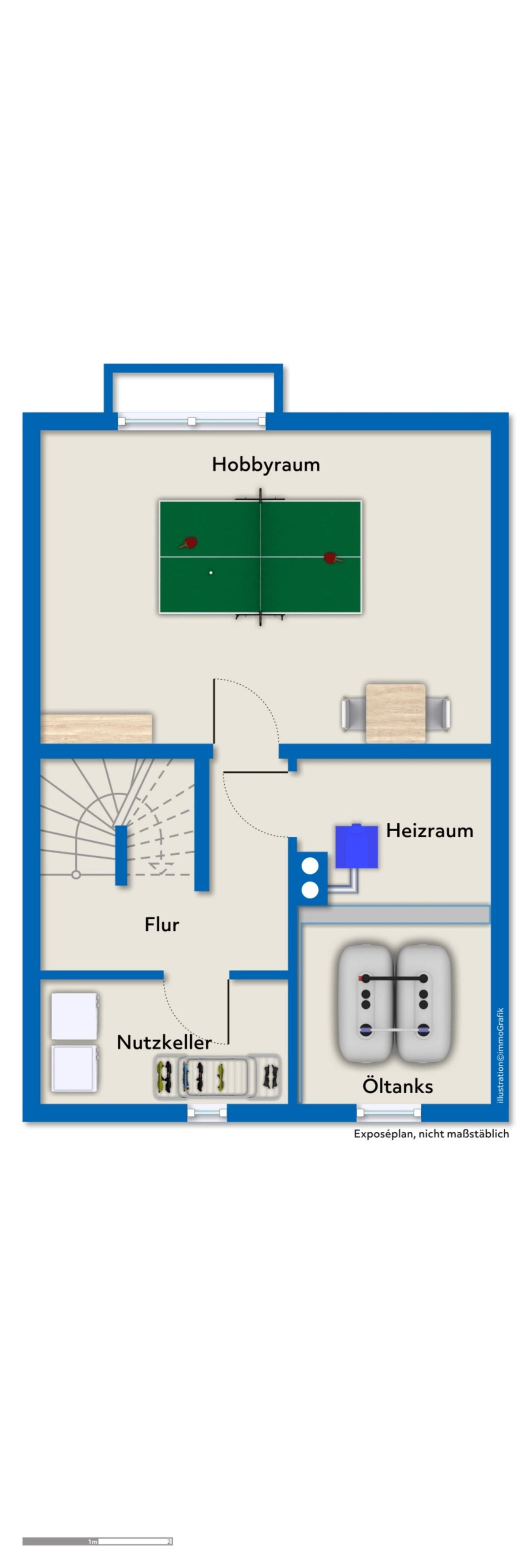 Hier verbirgt sich ein weiteres Highlight: der großzügige Hobbyraum mit ca. 24 m² Nutzfläche. Ob Fitness-Studio, Partykeller oder Werkstatt – hier ist alles möglich. Daneben finden sich Heizraum, Öltanks und ein praktischer Nutzkeller.